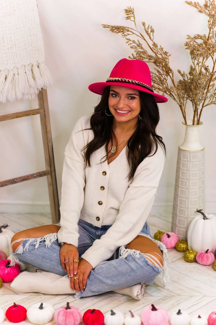 This stylish hot pink panama hat features a medium brim and a contrasting gold chain strap wrapped in black ribbon. Perfect for adding an extra pop of style to any outfit!