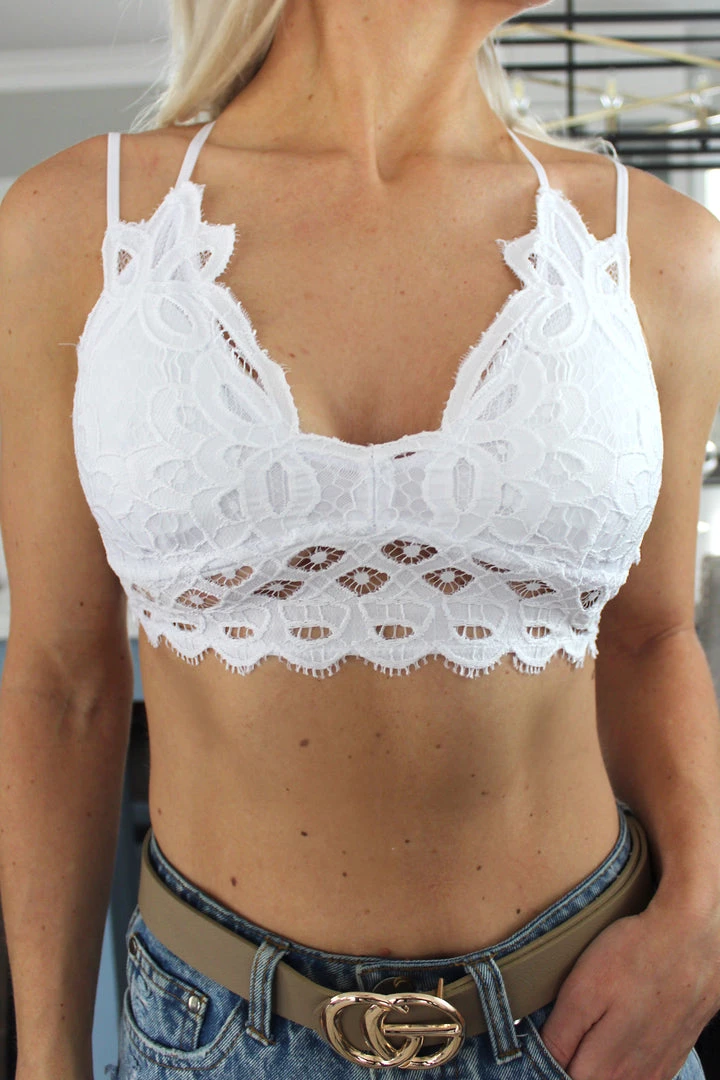 This must-have scalloped lace bralette is perfect for all seasons! Featuring double adjustable straps, removable padding and stretchy crochet lace along the back. It looks cute under any tank in the summer and fits perfectly under slouchy sweaters in the fall/winter!