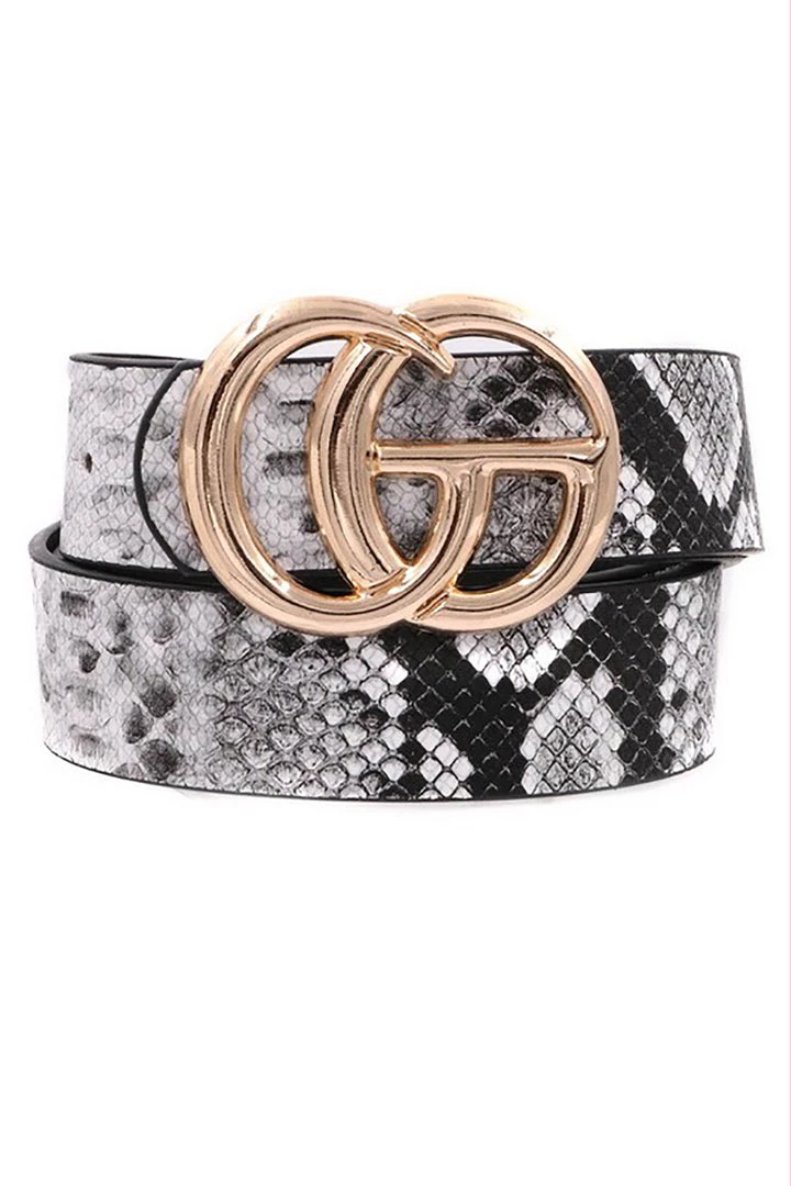 Faux leather multi color snakeskin belt with gold buckle and black and white accents throughout.