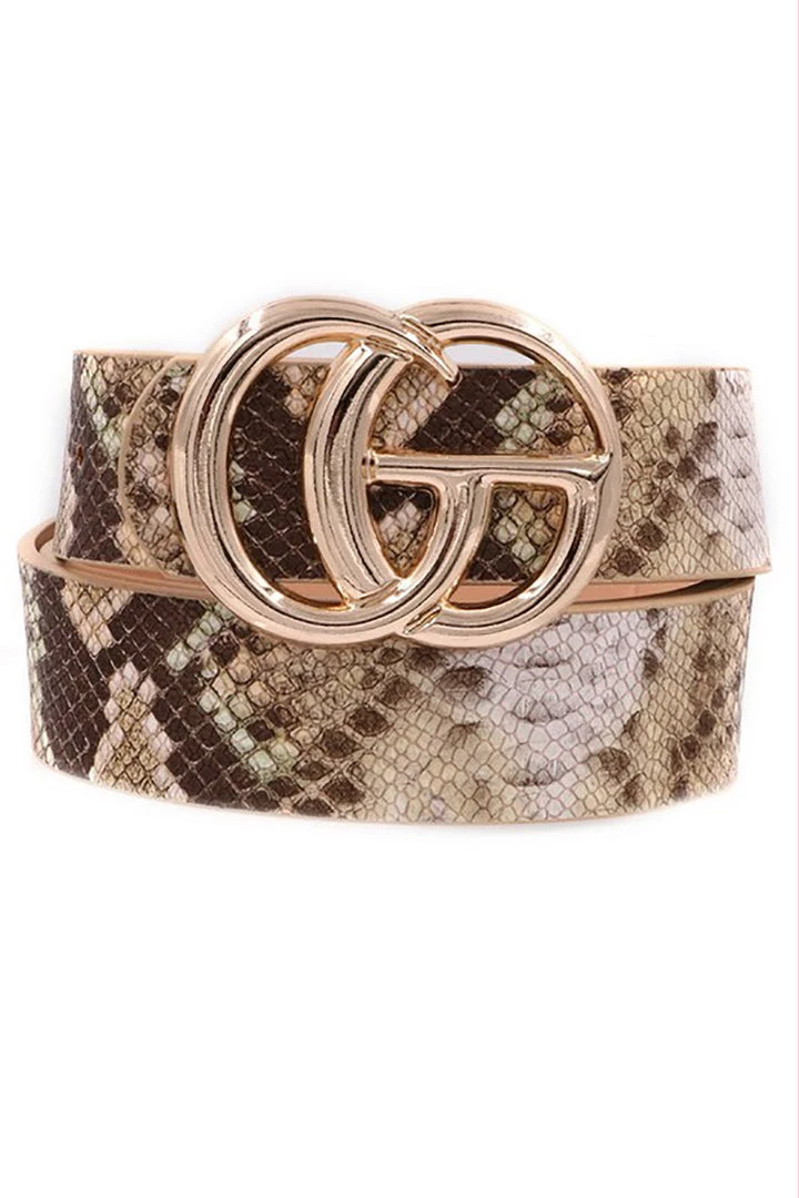 Faux leather multi color snakeskin belt with gold buckle and gold accents throughout.Â