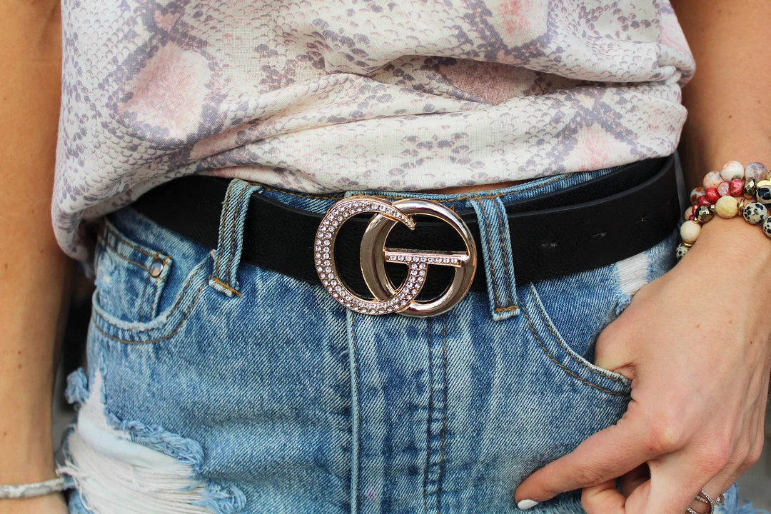 Chic black belt with a gold rhinestone studded G buckle.Â