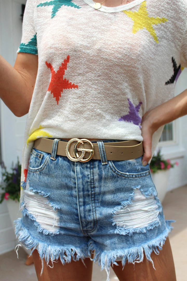 Trendy taupe belt with a gold rhinestone studded GG buckle.