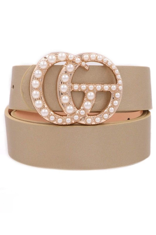 Taupe faux leather belt with pearl studded G buckle.