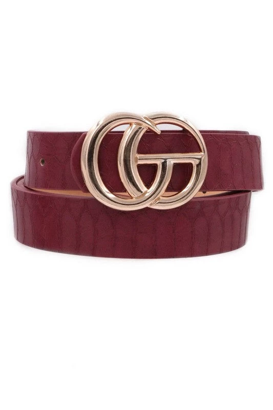 Burgundy red snakeskin faux leather belt with gold G buckle.
