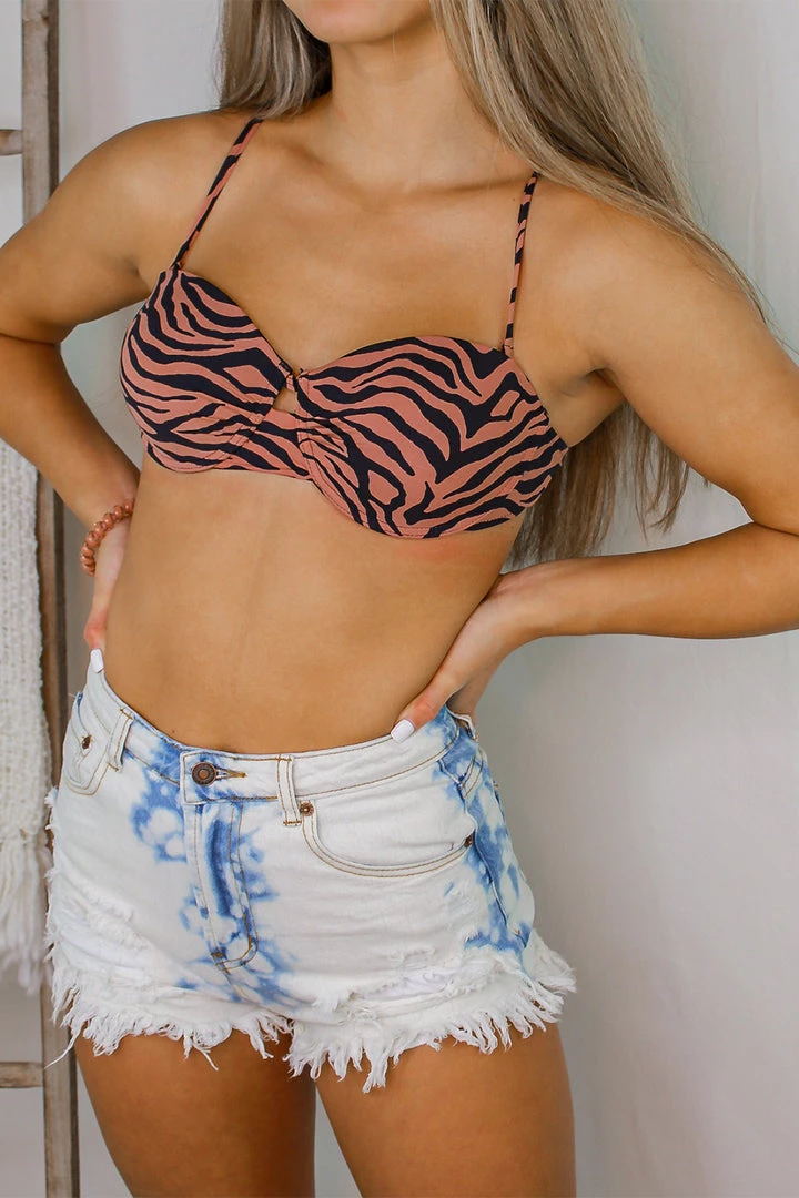 This bikini top features a black and mauve tiger pattern, adjustable & removable straps, and side structure underwire with a fully padded bust. The high waisted bottoms feature ribbed sides and scrunch detail on the back.