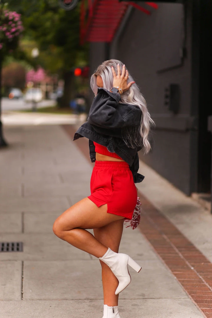 The classic black blue jean jacket just got a major upgrade! Featuring an open front bodice with silver buttons, cute rhinestone fringe trim details along the back and raw hems. Style this denim jacket with some chunky white booties and a cute graphic tee!