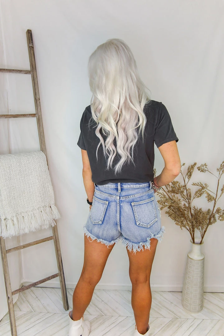 High waisted medium wash denim shorts with dripping rhinestone fringe along hem and edges.