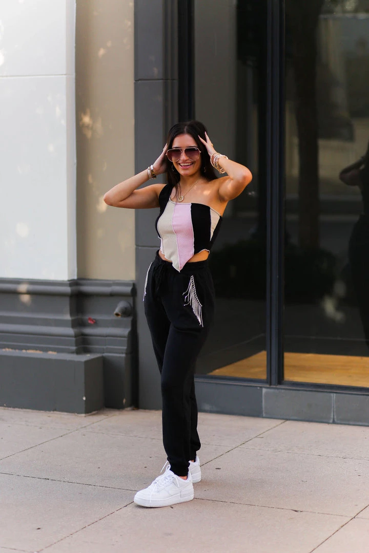 Comfy black high-waisted joggers featuring pockets with rhinestone fringe detail and a drawstring waistband.