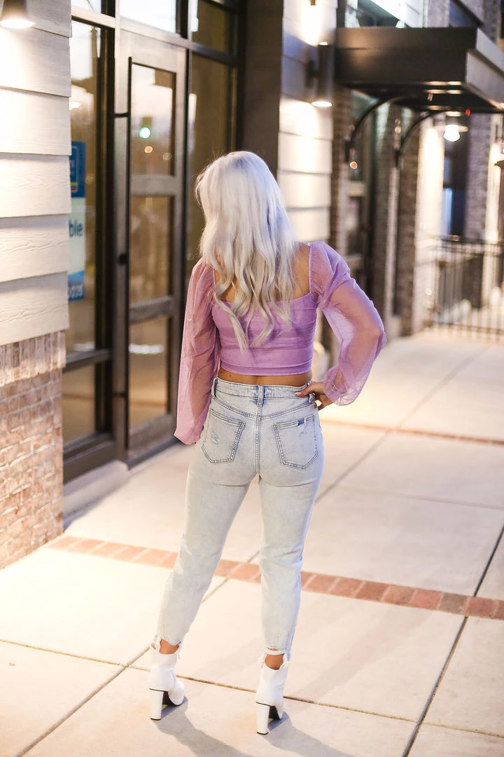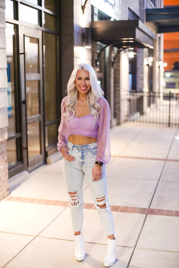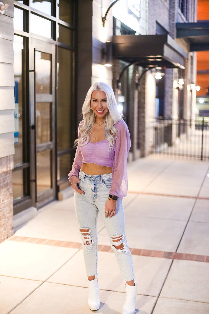 This dreamy light purple blouse features sheer long sleeves made of gorgeous dobby dot mesh, a cropped fit bodice and a zip closure on the back. We love this look with split hem jeans and heels for a dressy casual style.