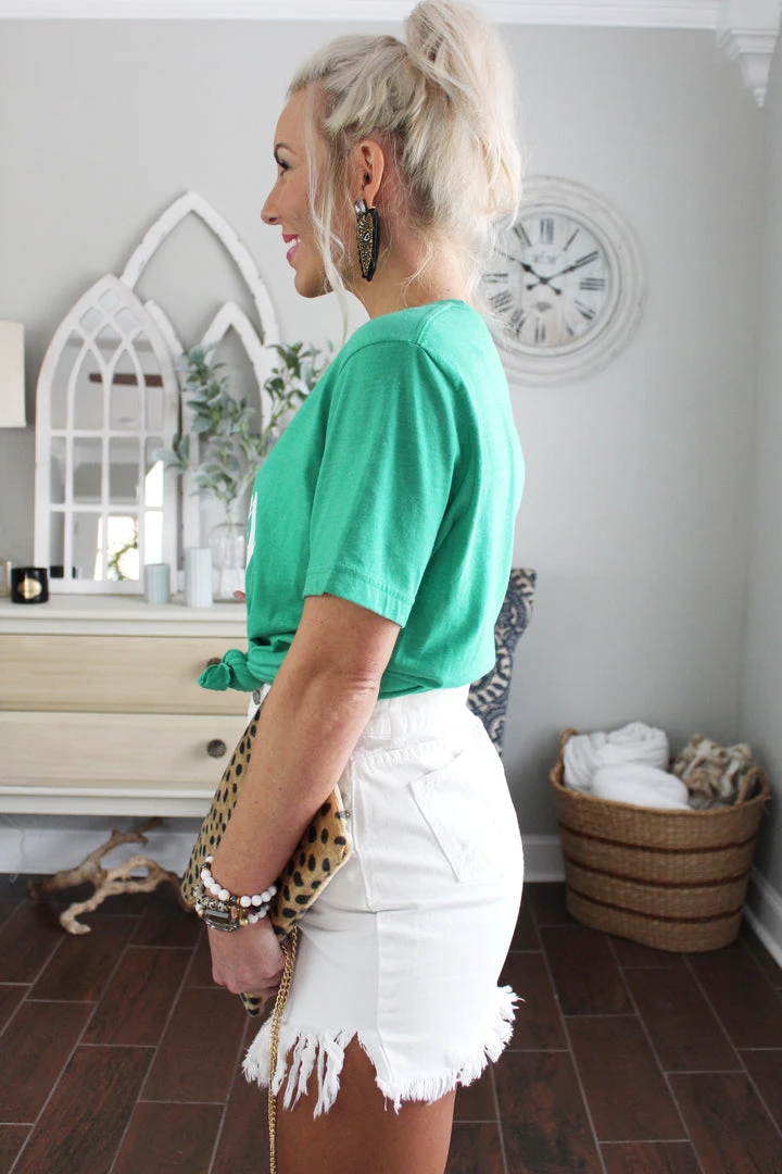We are loving this asymmetrical distressed skirt for spring and summer! Featuring distressed detailing on the front and back with frayed detailing on the hems. Complete with front and back pockets, you are sure to love this high waisted denim skirt!