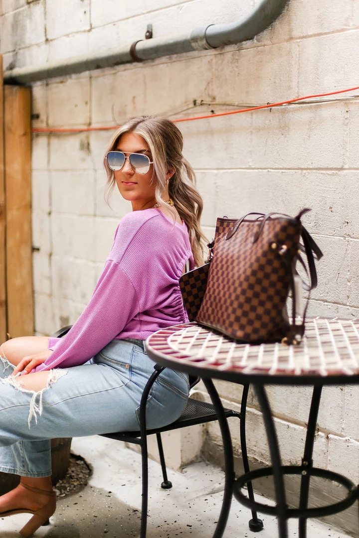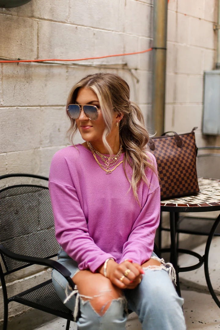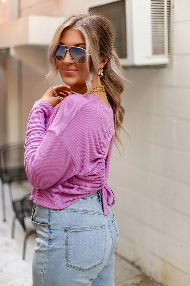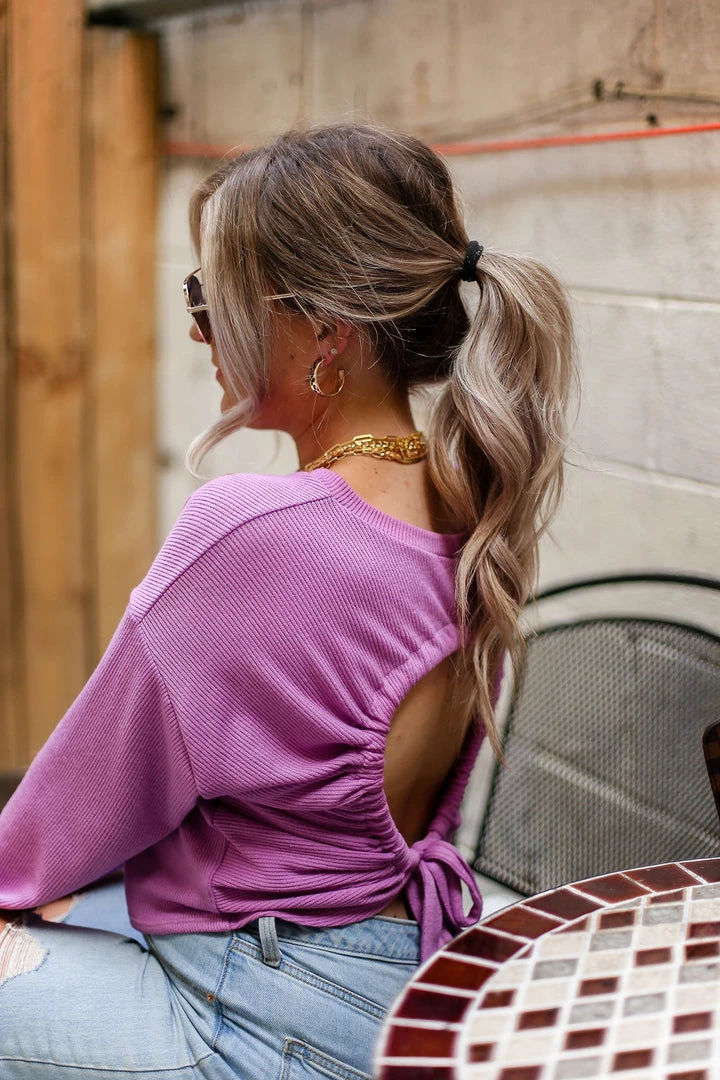 Trendy orchid purple knit long sleeve top with adjustable cutout tie in the back.