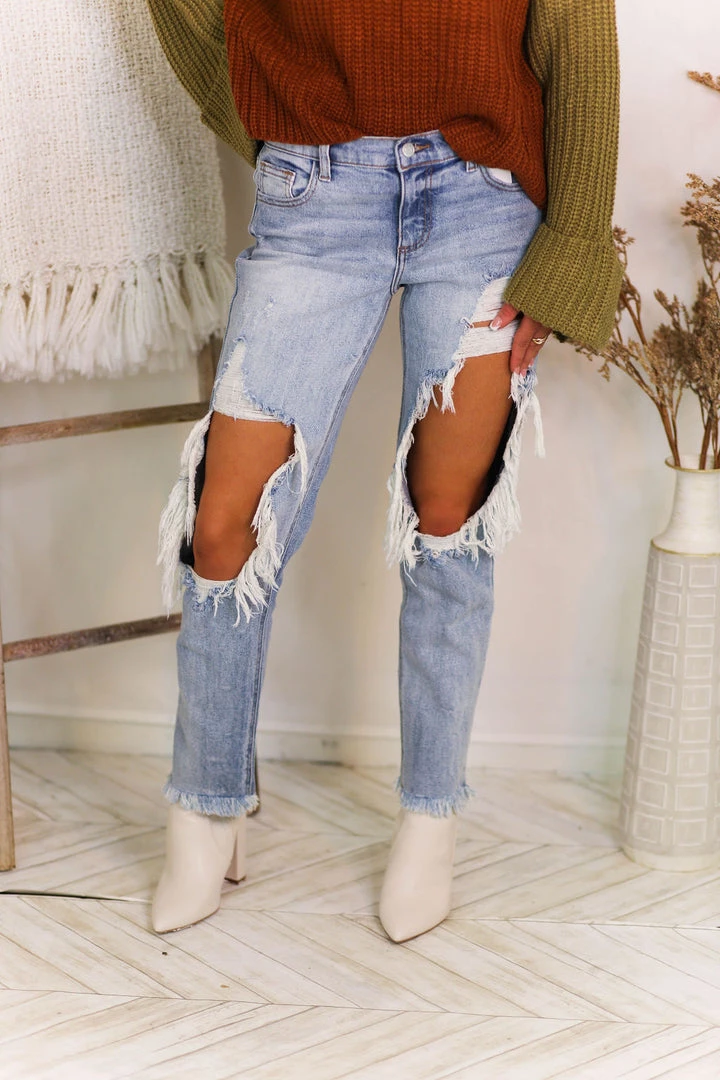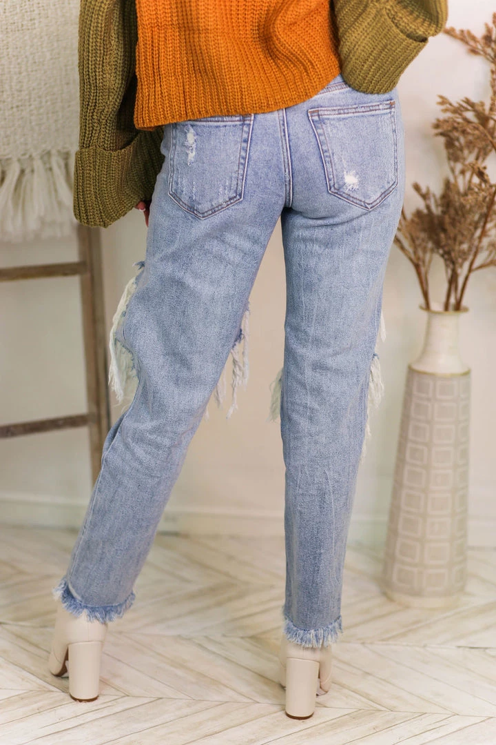High-rise medium wash jeans with distressing throughout the front, high rise waist and relaxed fit. Hem can be uncuffed.