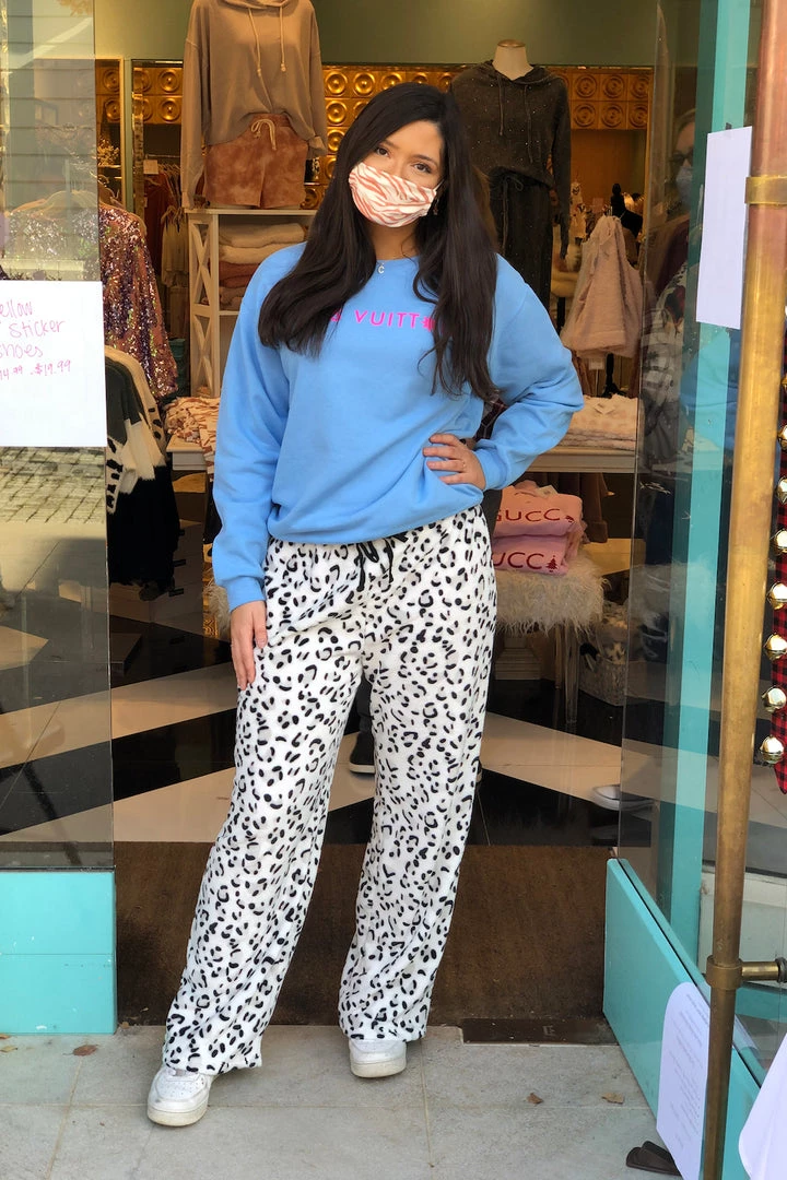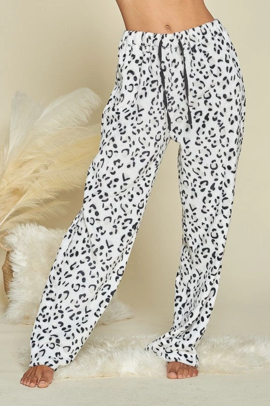 Soft leopard print pajama pants featuring a drawstring waist, cozy soft fabric and a wide leg fit.
