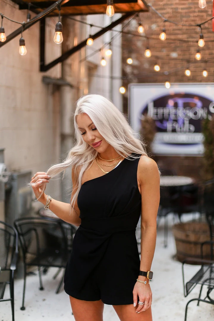 Trendy black romper with one shoulder strap and a twist detail along the waist.