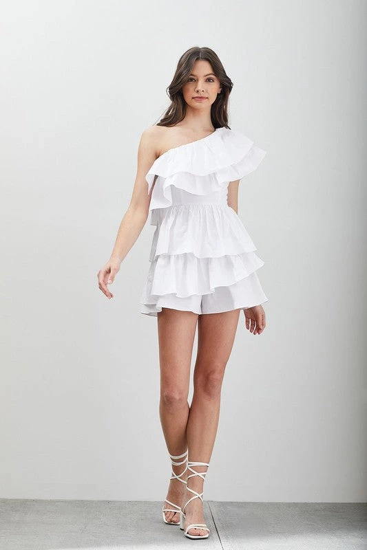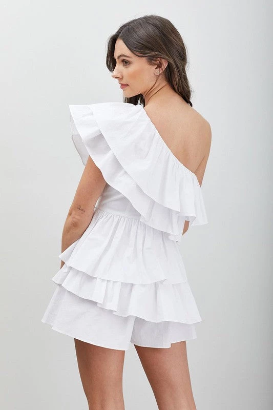 Do + Be White One Shoulder Ruffle Romper Dress Women’s Clothing