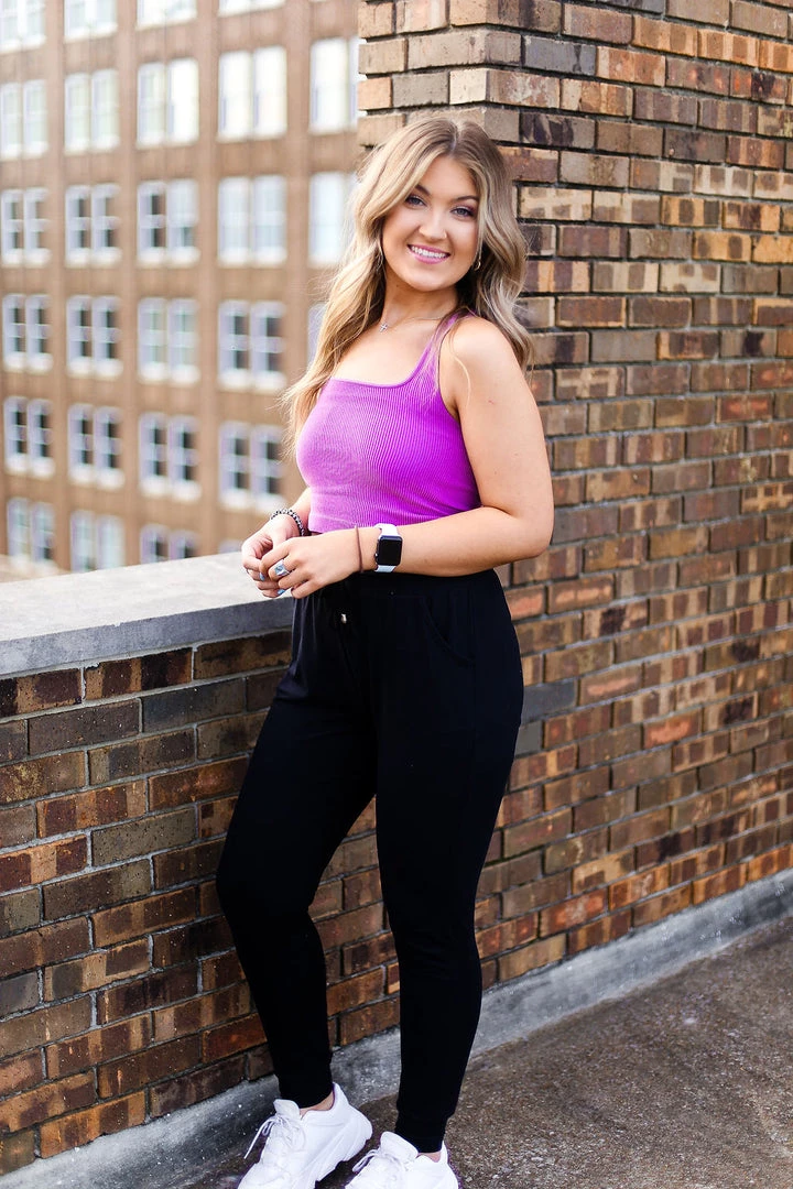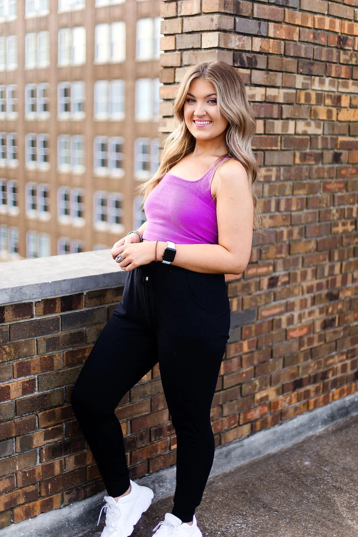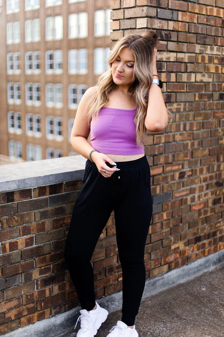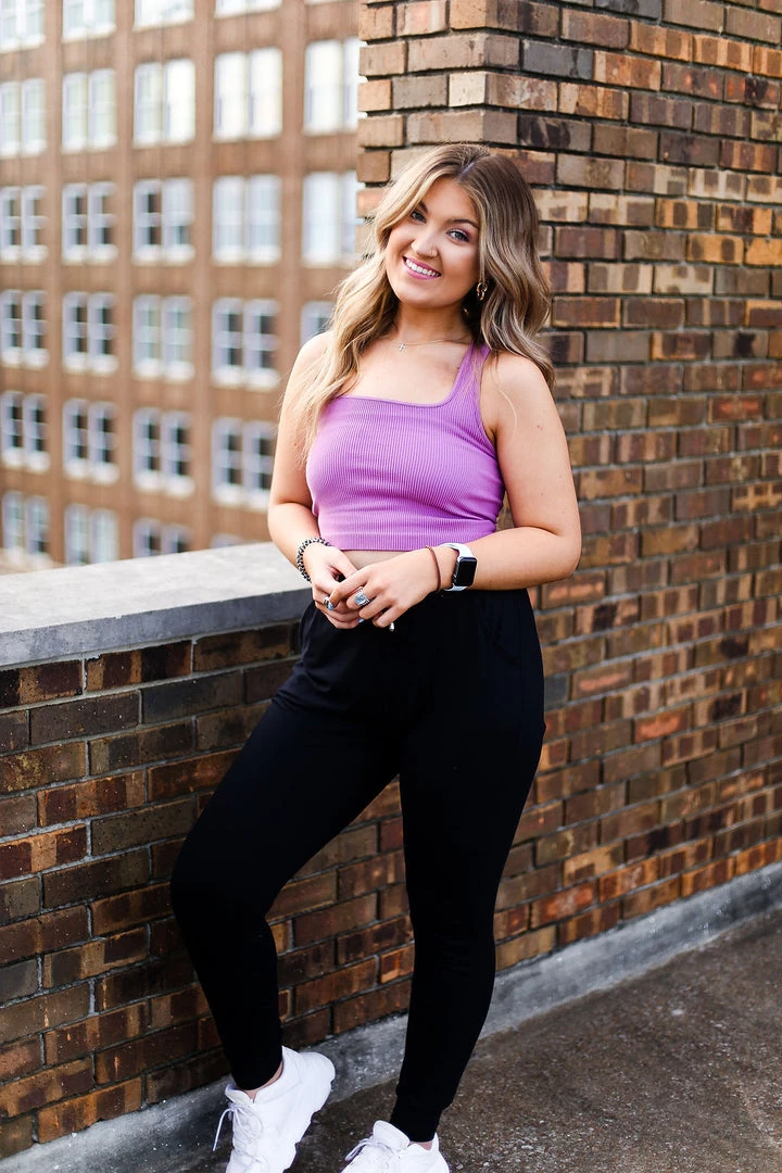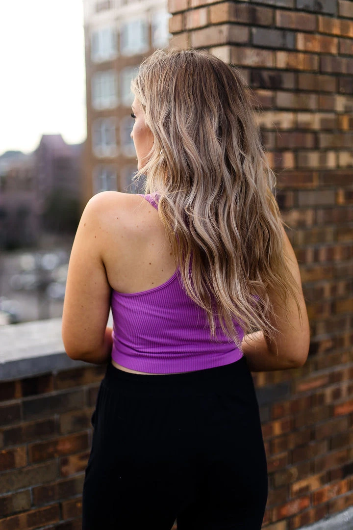 Soft and stretchy seamless ribbed fabric shapes this must have basic tank with a square neckline, racerback style straps and a semi cropped fit. Pair this top with your favorite denim shorts and tennis shoes or keep it casual with some oversized sweatpants!