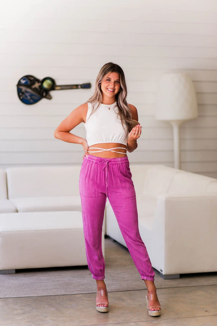 Trendy hot pink high-waisted joggers featuring pockets, drawstring waistband and pockets. These are so soft and lightweight!