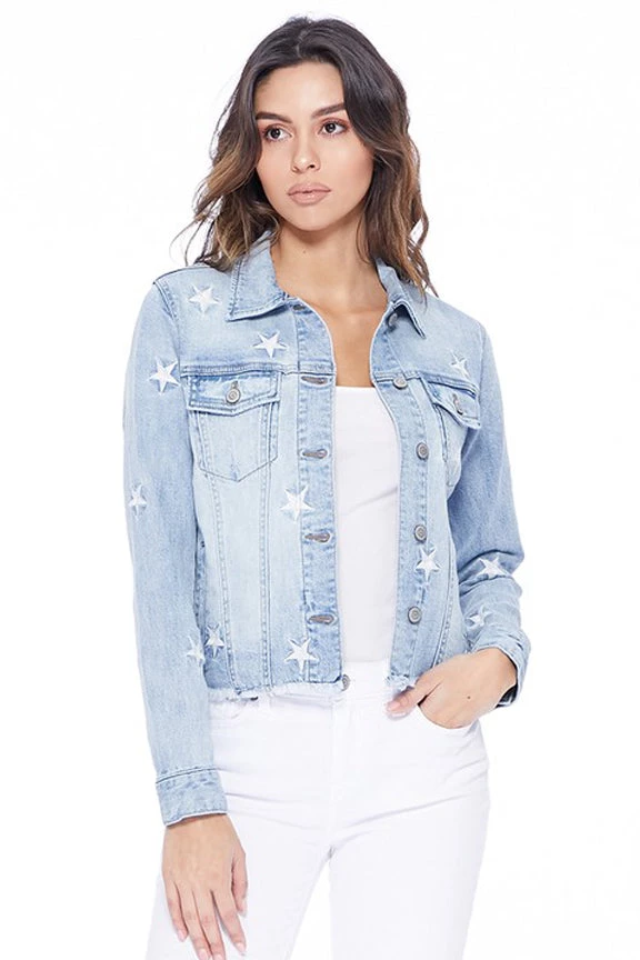 The classic medium wash blue jean jacket just got a major upgrade! Featuring an open front bodice with silver buttons, a cute white embroidered star details throughout and raw hems. Style this denim jacket with some chunky white booties and a cute graphic tee!