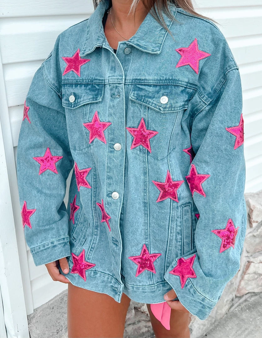 Fantastic Fawn Women’s Clothing Pink Star Sequin Denim Jacket