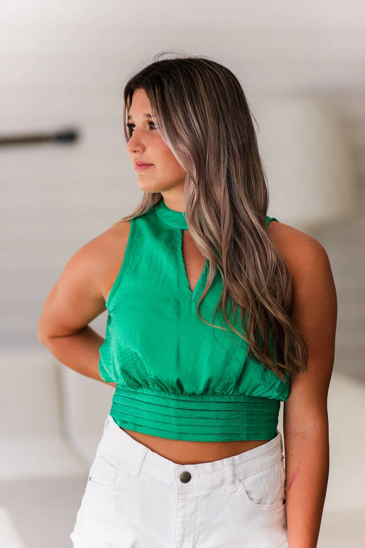 Kelly green halter neck top with front slit, back keyhole closure and adjustable waist tie.