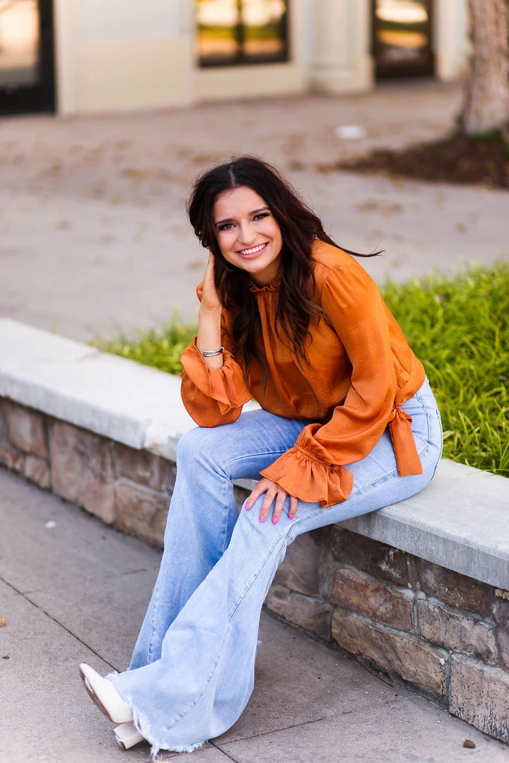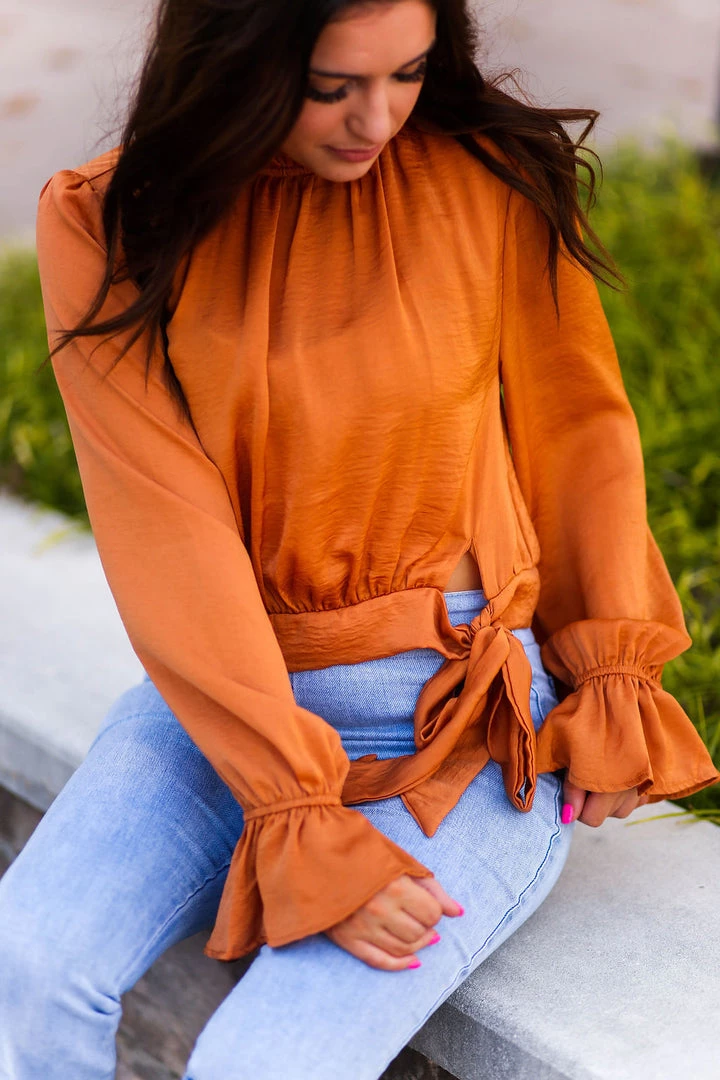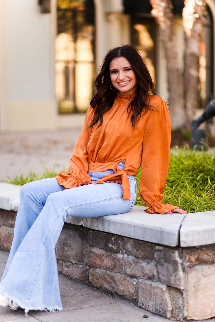 This cute orange blouse features long sleeves, a mock neck style and a self tie along the hemline. We love this look with skinny jeans and boots for Thanksgiving dinner!Â