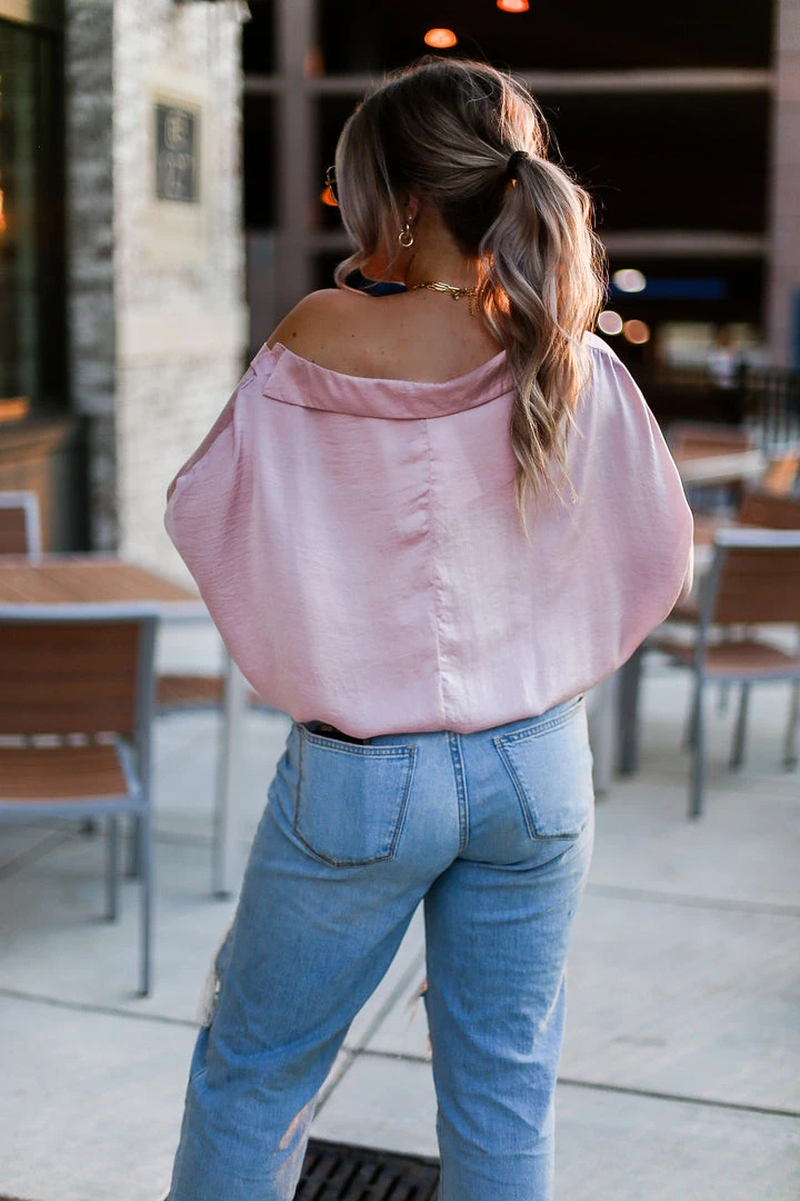 This dreamy light pink blouse features oversized sleeves, a semi cropped fit bodice and elastic hem. We love this look with split hem jeans and heels for a dressy casual style.