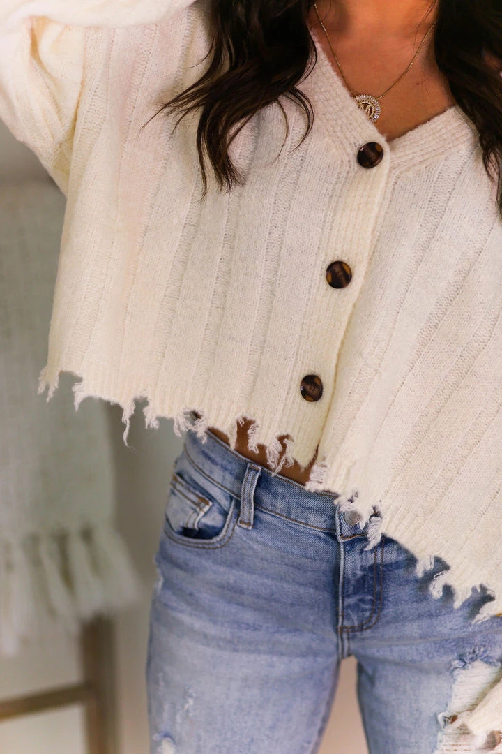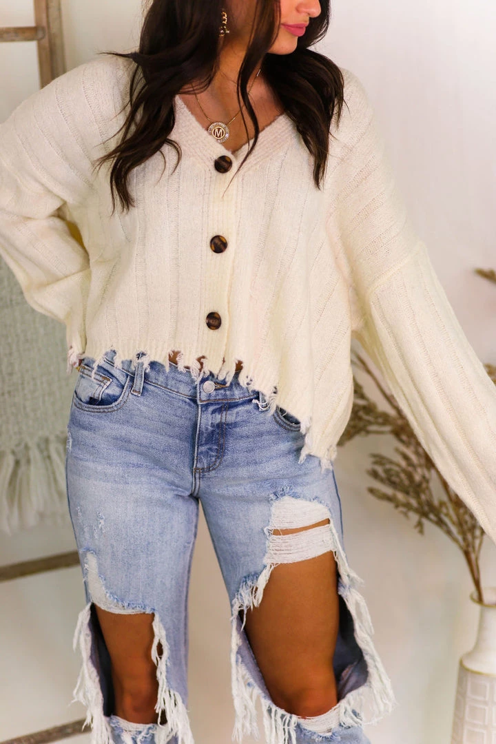 Cute soft knit open bodice cardigan with buttons on the front and a ribbed material that flows into distressed hems.