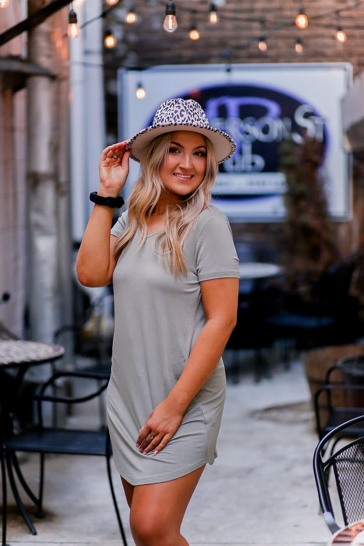 Cute olive green v-neck t-shirt mini dress. Makes the perfect staple dress for your wardrobe!