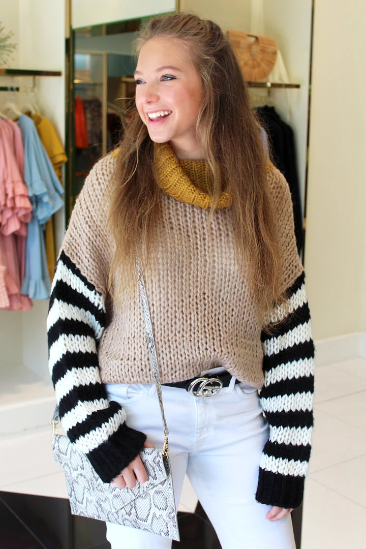 Falling for this adorable knit sweater with a mocha colored bodice, mustard yellow cowl neck and finished with fun black and white striped sleeves!