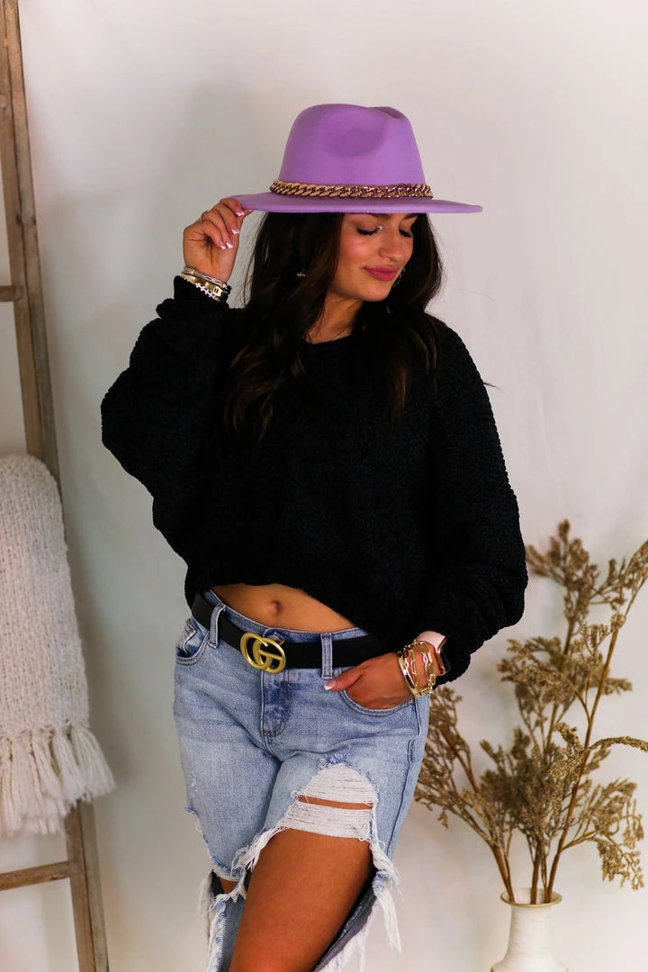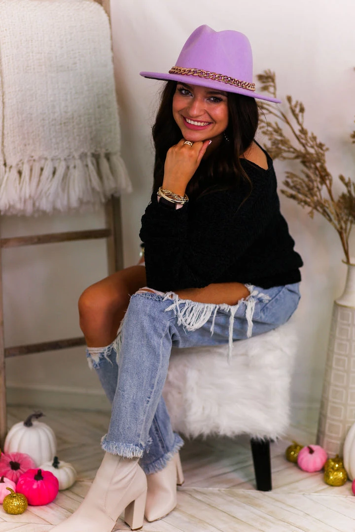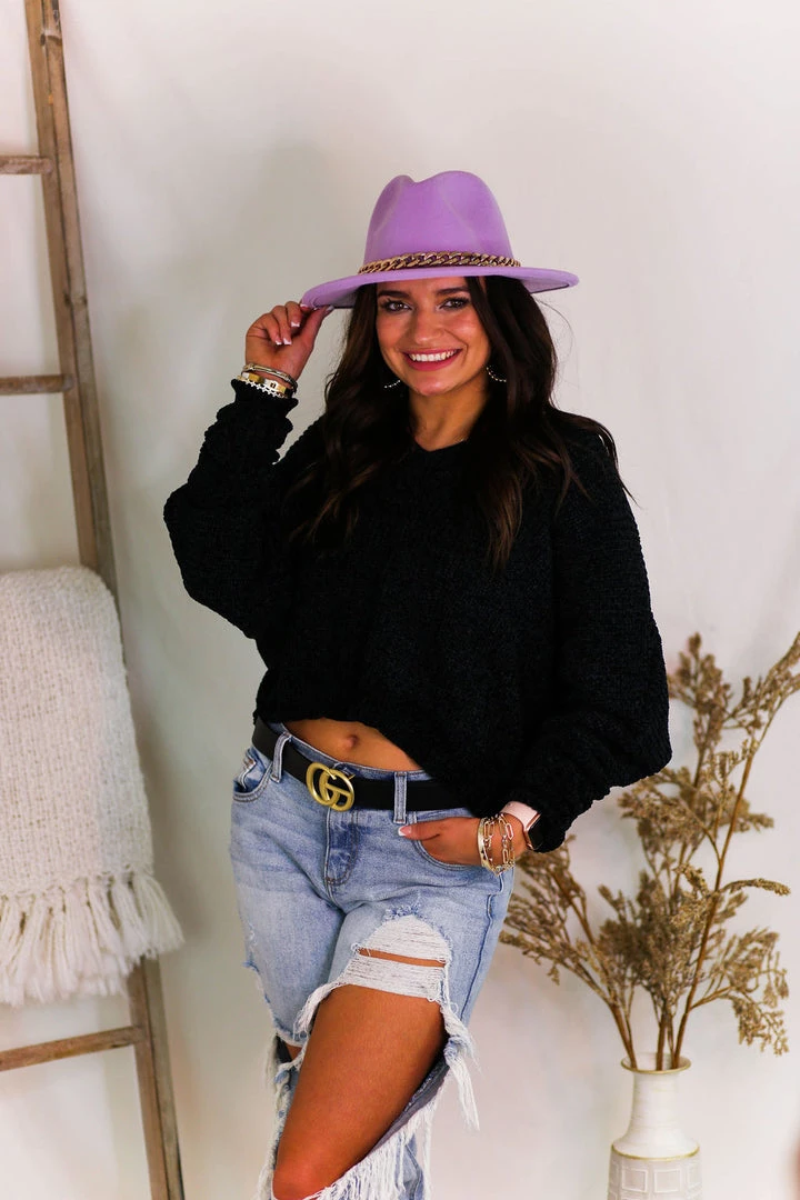 Soft chenille knit sweater with wide v-neck style and ribbed hemline.