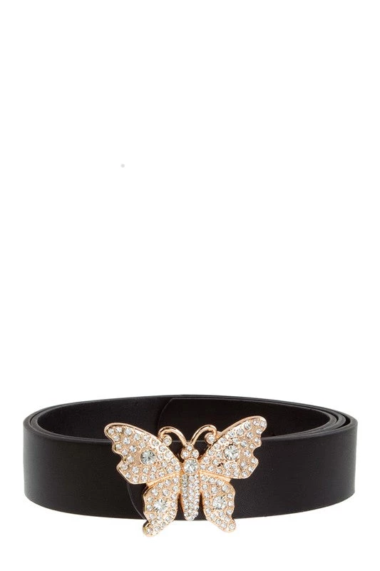 Black faux leather belt with rhinestone butterfly buckle.