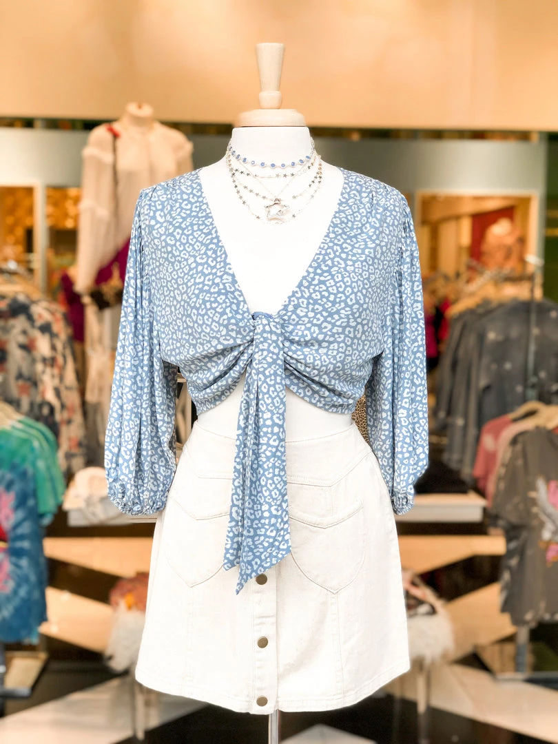 In The Beginning Women’s Clothing Baby Blue Leopard Front Tie Top – RESTOCK