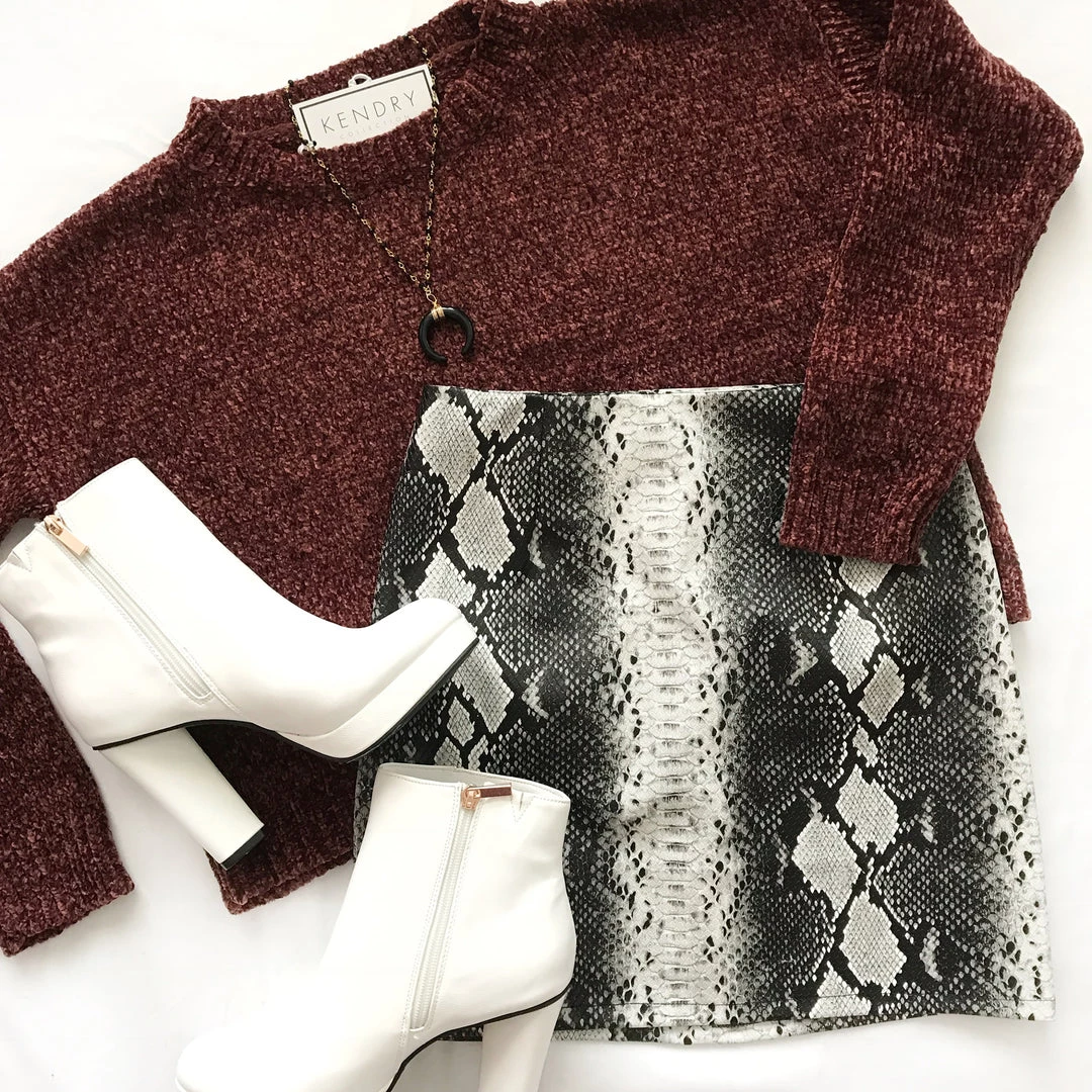 You’re sure to own the night when you slip on this sleek faux-leather mini skirt. Drenched in a wildly chic snake skin pattern, complete with a hidden black zipper in the back, this edgy mini boasts a classy meets rebel vibe.
