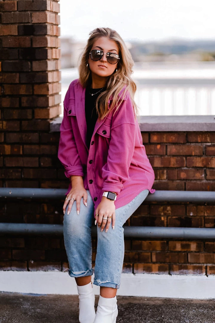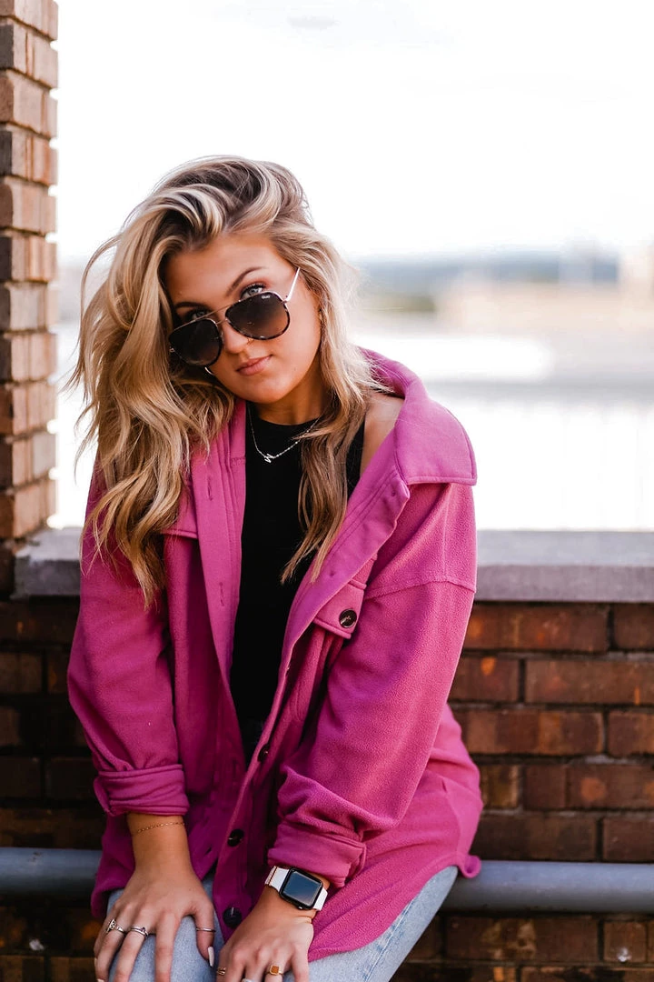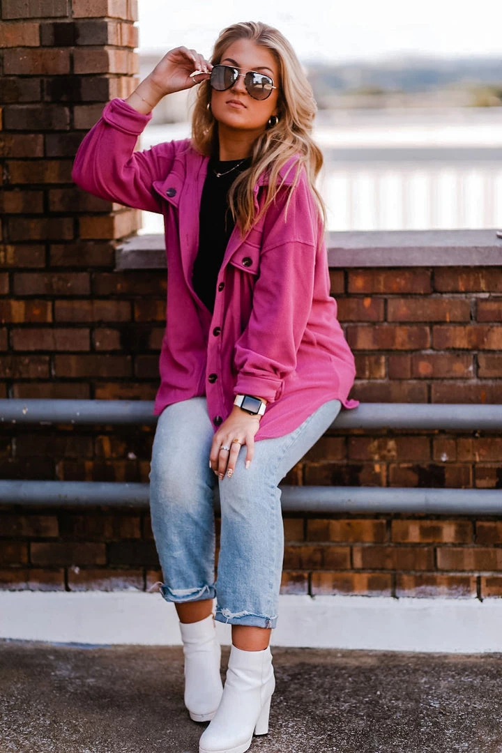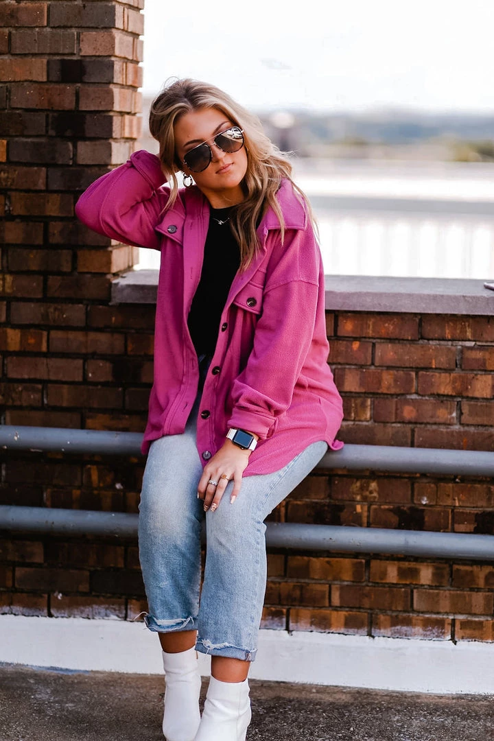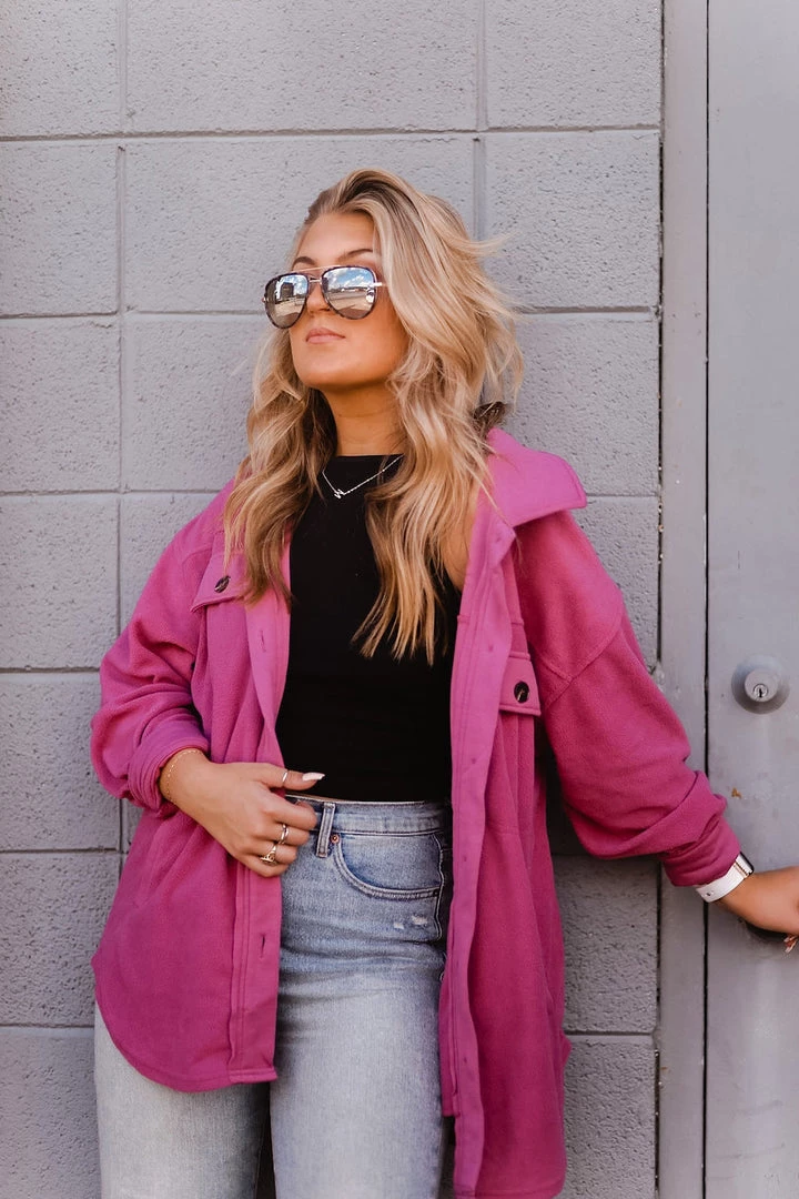 This plush oversized shacket is a must-have for all seasons! Perfect for layering over activewear or basic tops, this soft jacket features a button-down front with two chest pocket details. It’s made with ultra soft fleece featuring a classic collar, dropped shoulders, long sleeves with button cuffs in a loose relaxed silhouette.