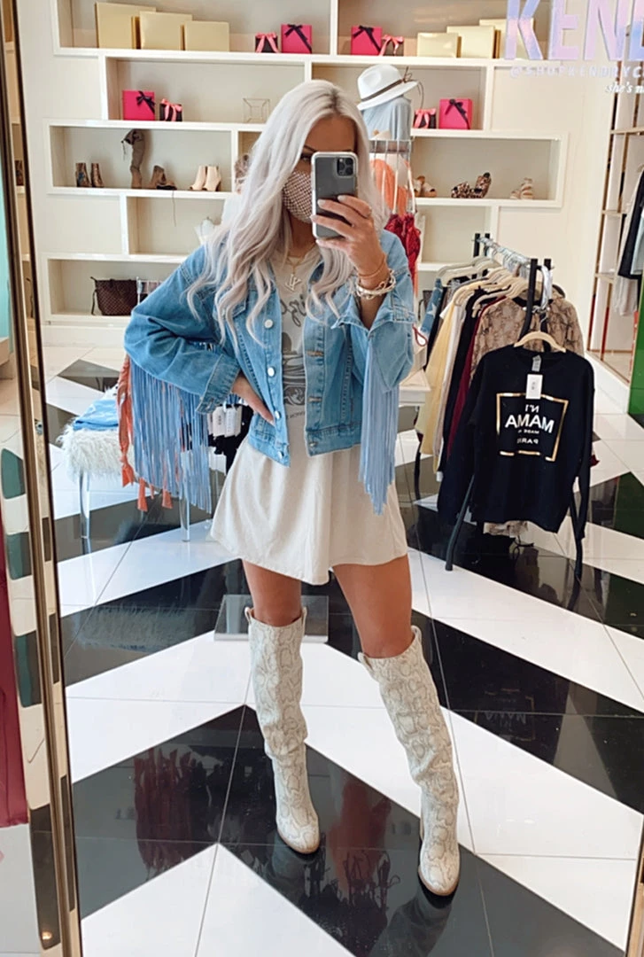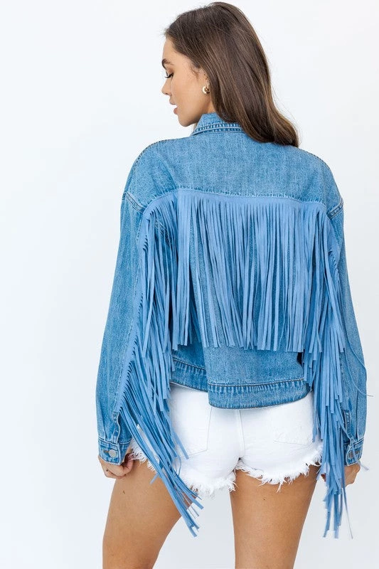 The classic medium wash blue jean jacket just got a major upgrade! Featuring an open front bodice with buttons and flashy row of fringe detail on the back. Style this denim jacket with some chunky white booties and a cute graphic tee!