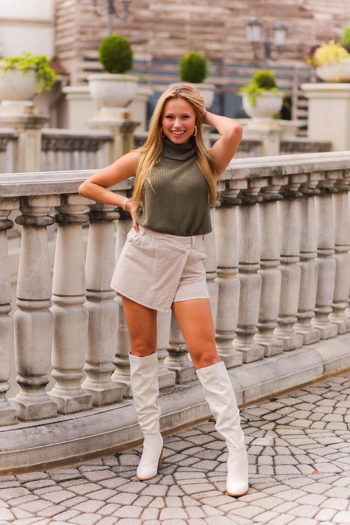 Our Green Sleeveless Turtle Neck Knit Top features a lightweight knit fabric with a turtleneck style. Perfect for tucking into skirts for the Fall!