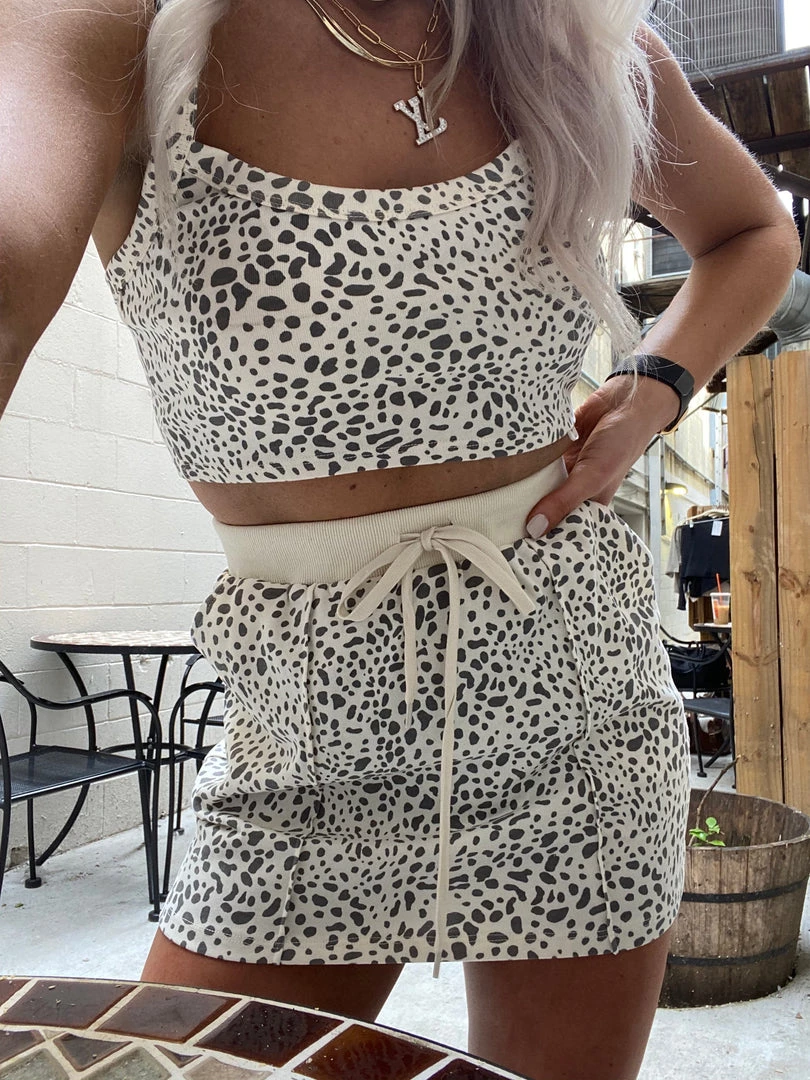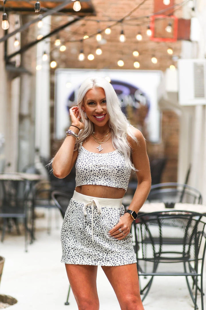 Trendy leopard two piece set featuring a soft lightweight leopard print material. The skirt feature an adjustable drawstring and contrasting ribbed waist band. The top is a cute basic cropped tank.