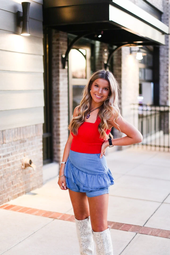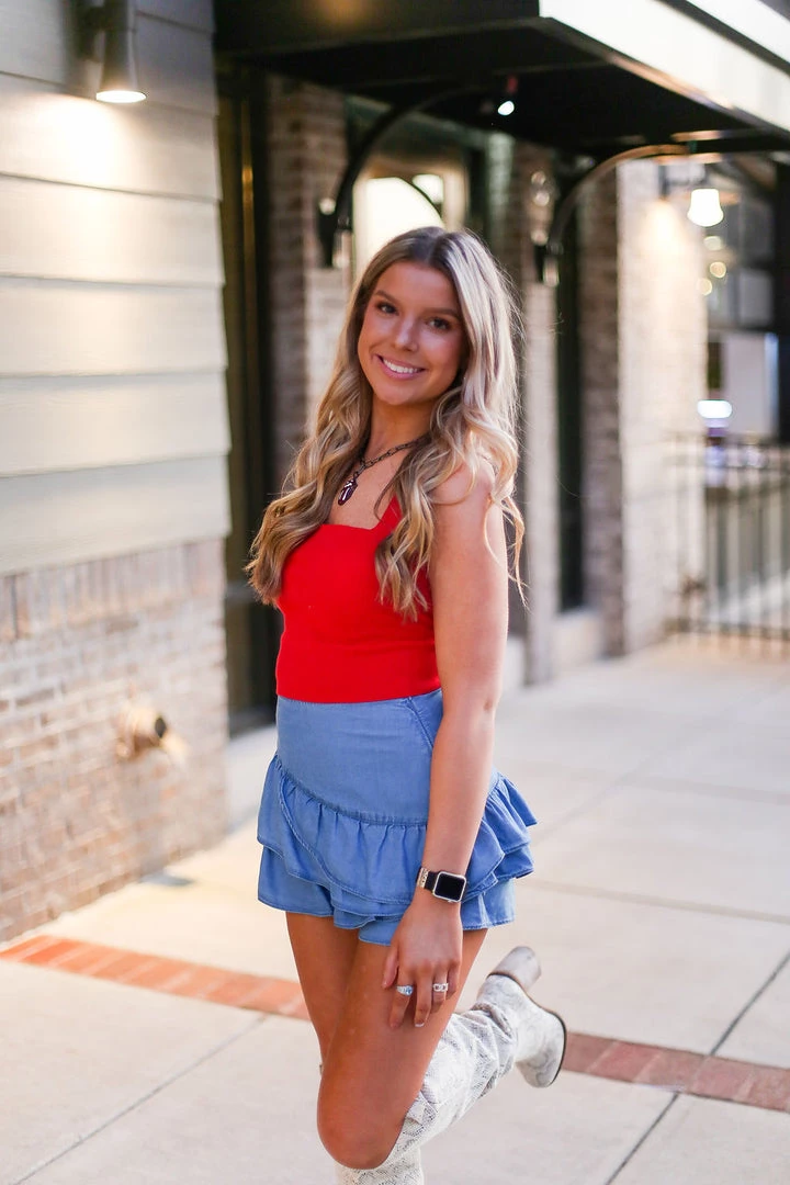Red knit tank top featuring adjustable criss cross back strap with self tie. Pair it with our denim ruffle skort and thigh high booties for the ultimate style.