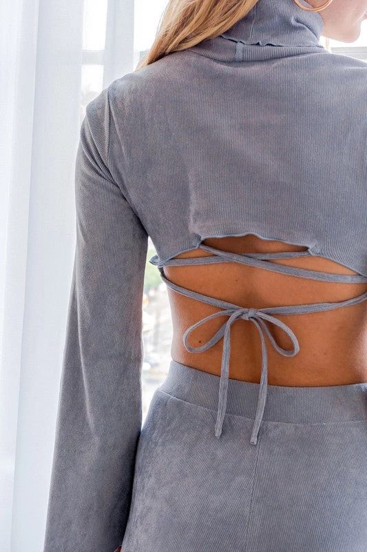 Le Lis Women’s Clothing Grey Bell Sleeve Lace Up Back Crop Top