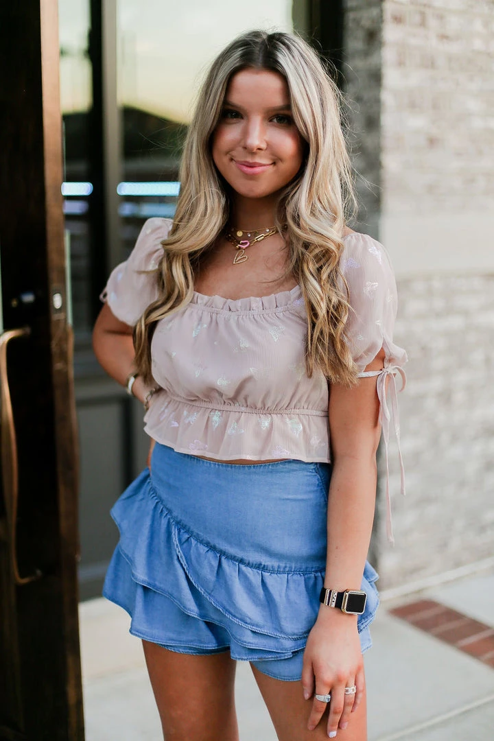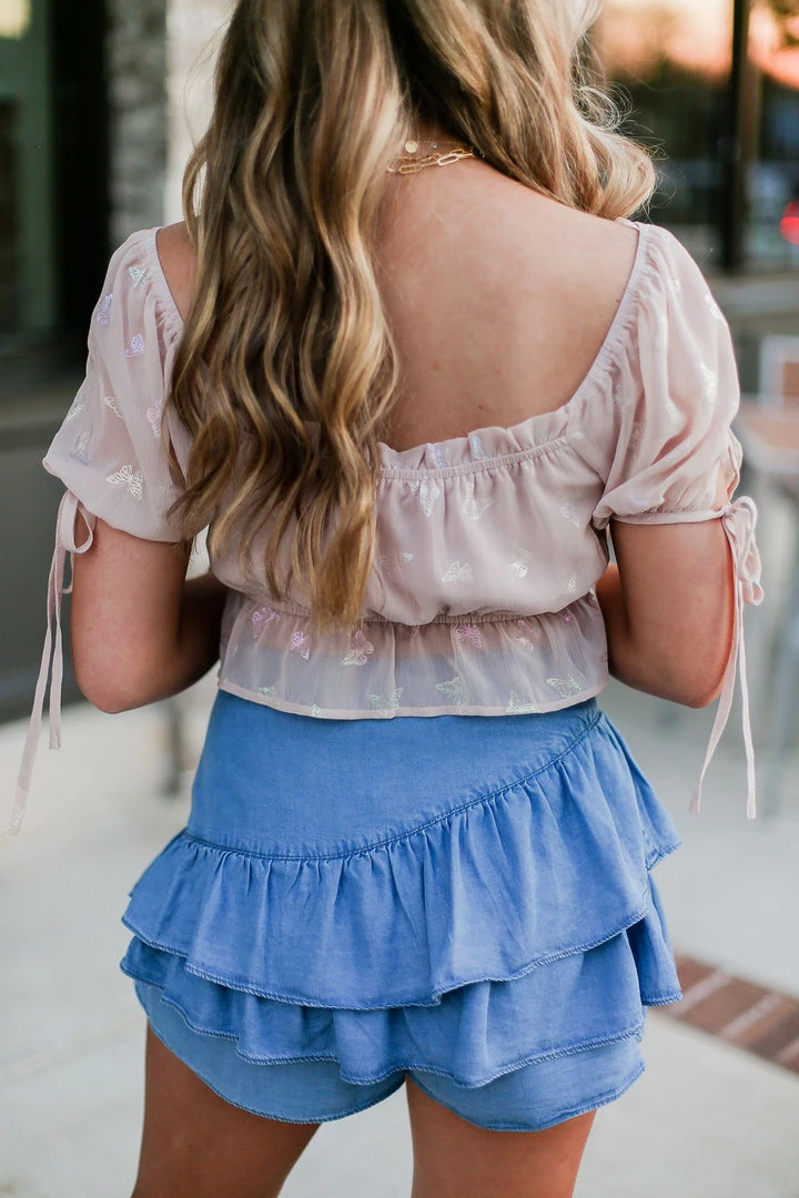 Cute pink crop top with elastic on the top and bottom and ruffle hem. Featuring self tie puff sleeves and cute holographic butterfly pattern. Team it with a pair of boyfriend jeans and some cute heels for the perfect dressy casual outfit!