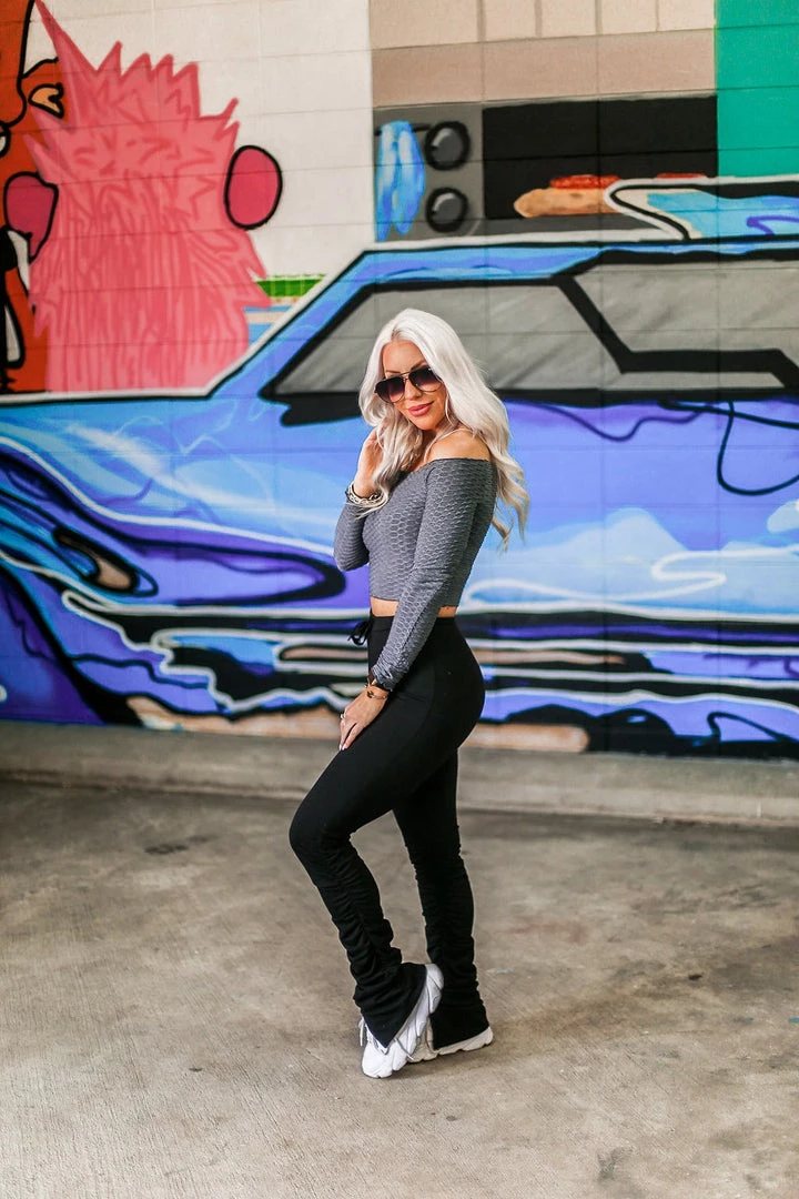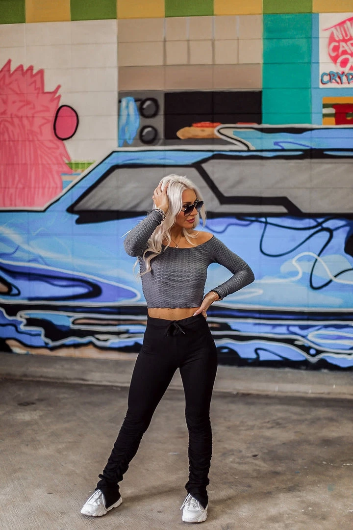 We are obsessing over this sporty embossed crop top! Features embossed fabric, a wide neck, off the shoulder fit and long sleeves. Pair it with your favorite split hem leggings and sneakers for a trendy athleisure style!
