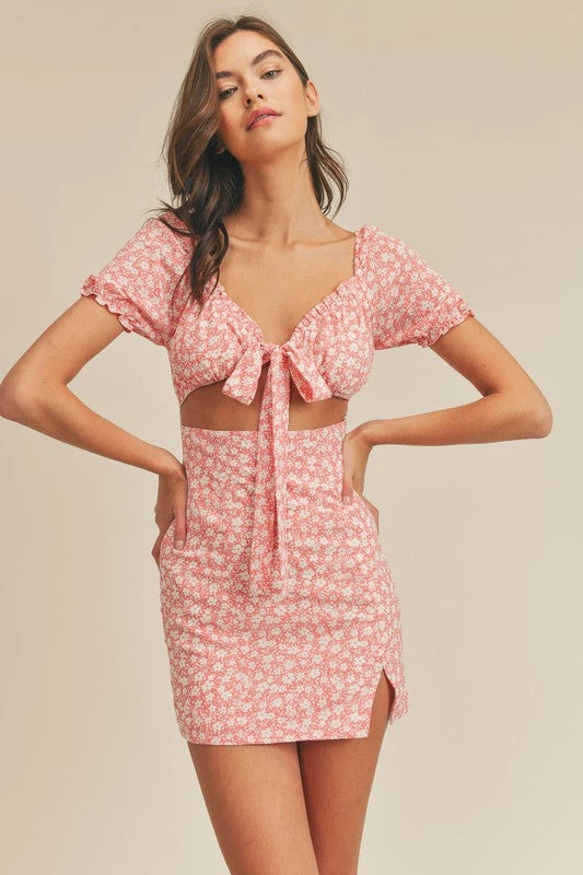 Short sleeve ditsy floral print mini fitted dress with front self ribbon tie and cutout detail. Side invisible slit and front mini slit.