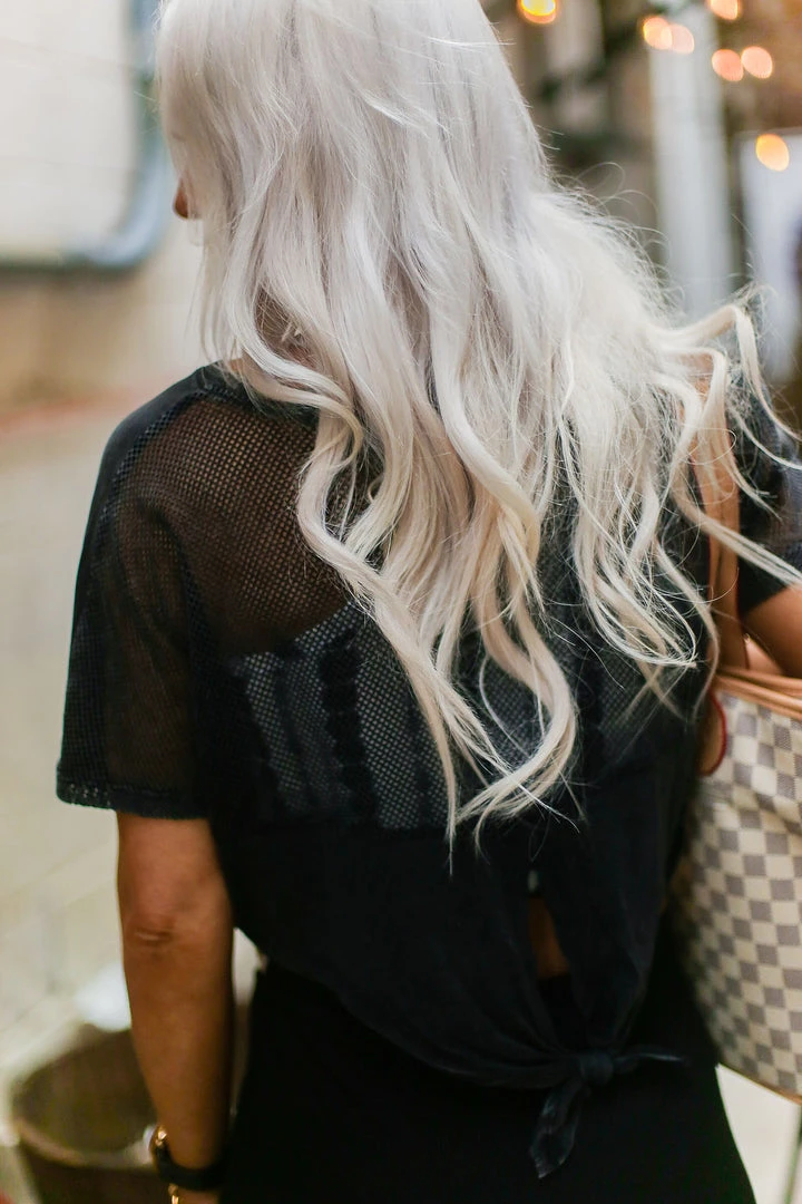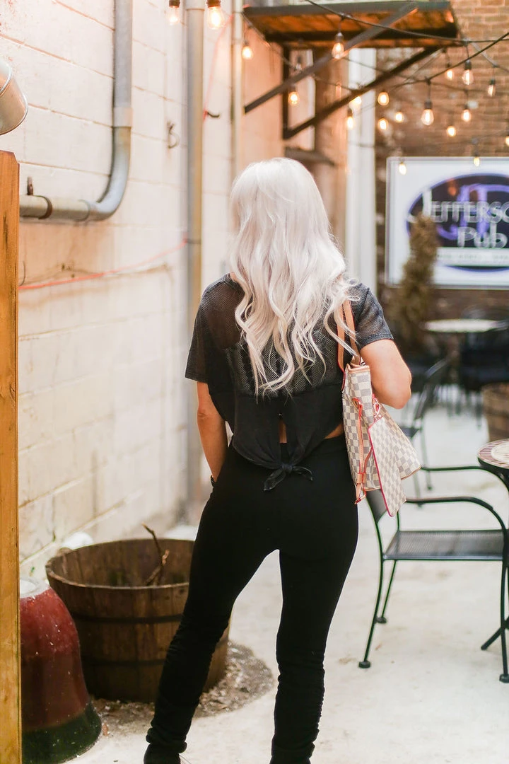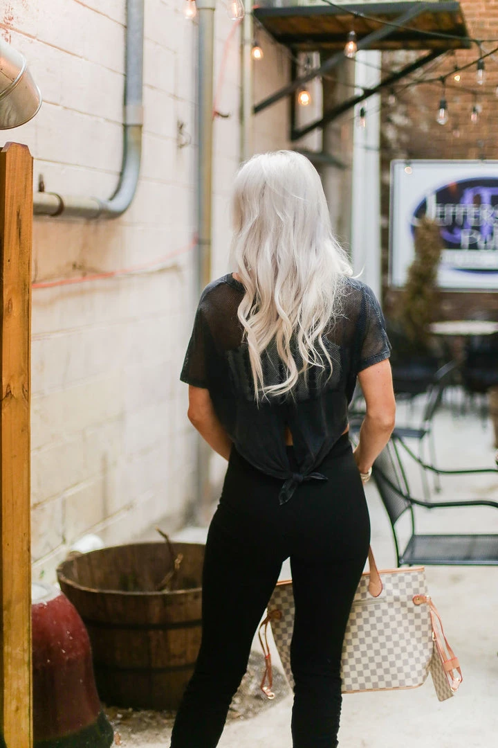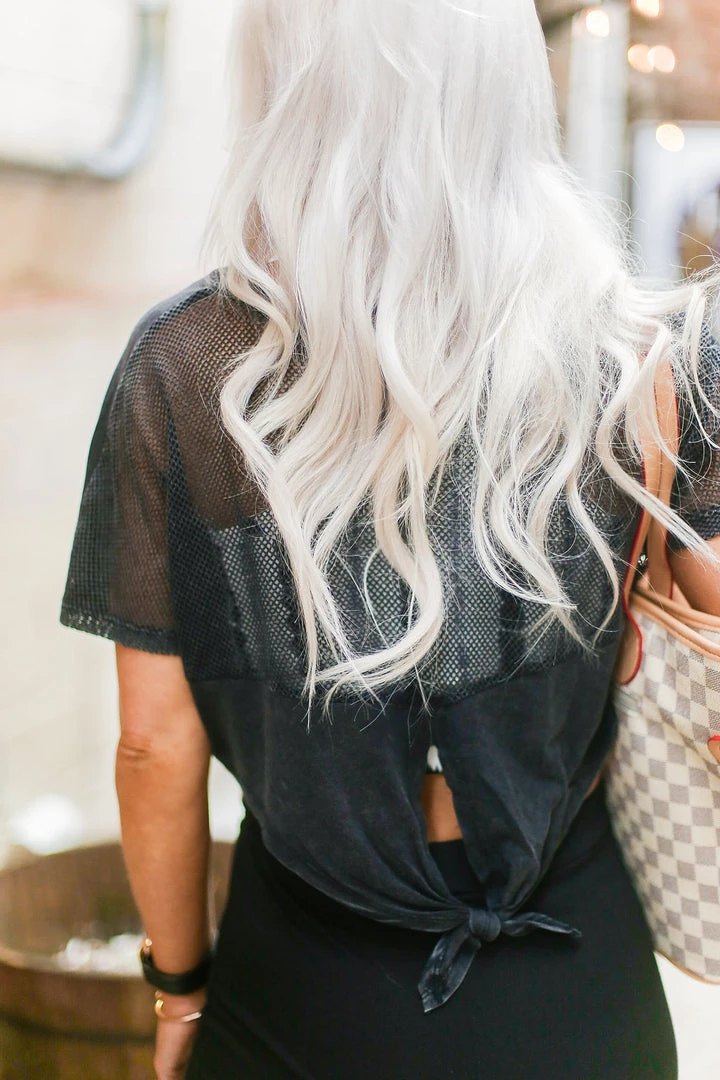 This flirty short-sleeved crop top is designed to wear both while working out or running around town! Featuring a solid opaque fabric front and a trendy mesh in the back with a self tie accent in the back. Throw this top on with your favorite leggings and sneakers and you’re ready to go!