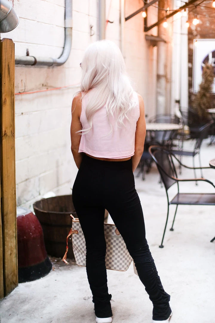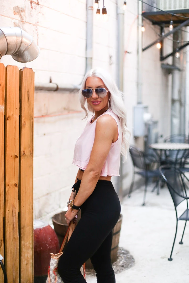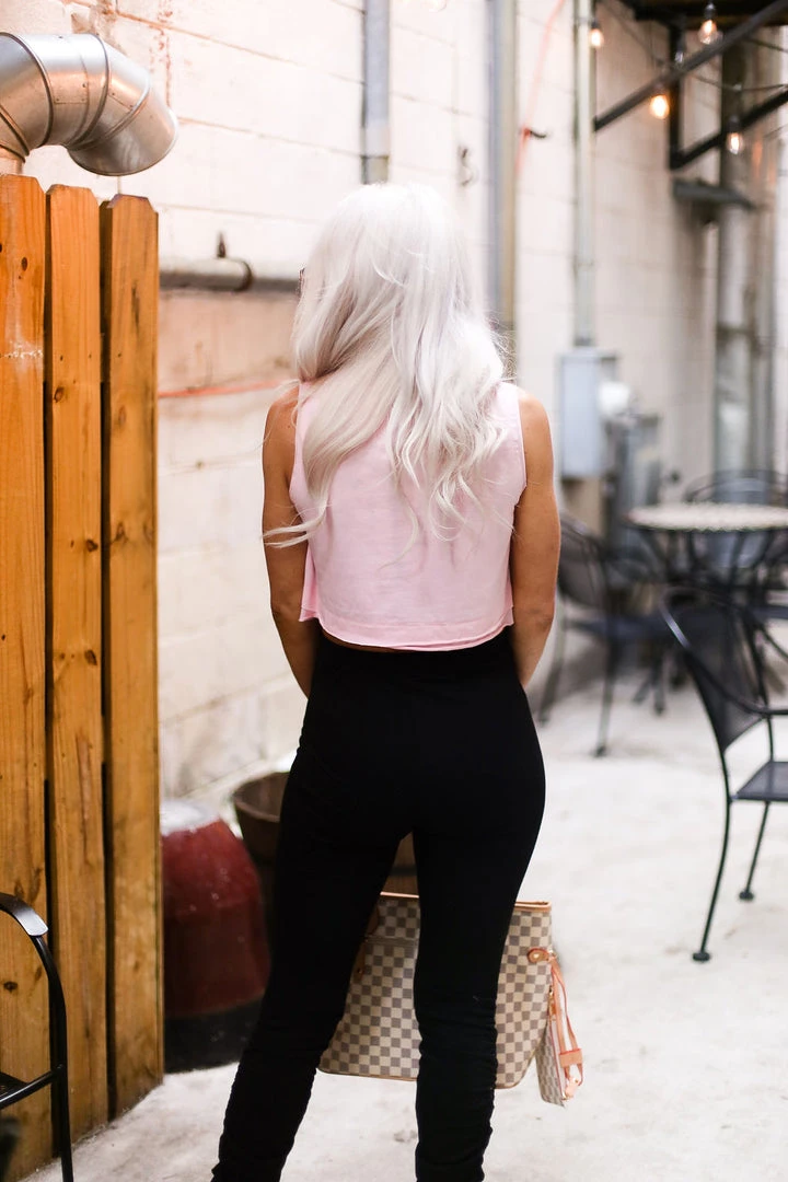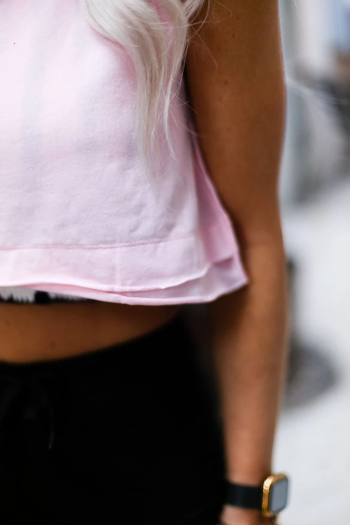 This must have basic tank features double layer raw hem and a cropped fit. Pair this top with your favorite leggings and tennis shoes or keep it casual with some oversized sweatpants!