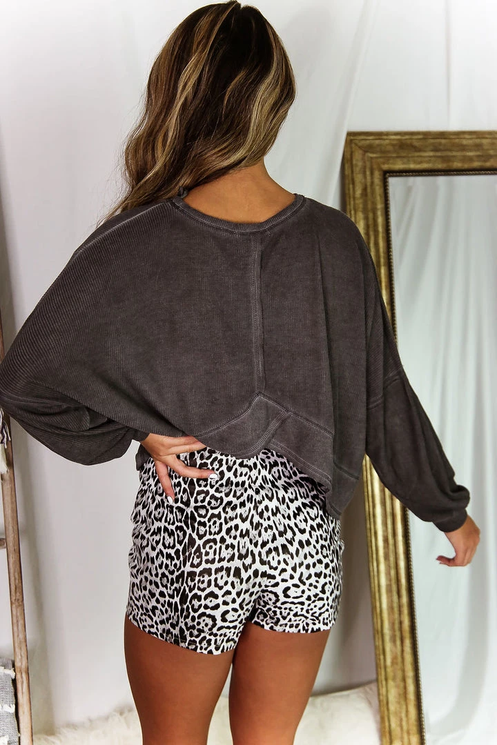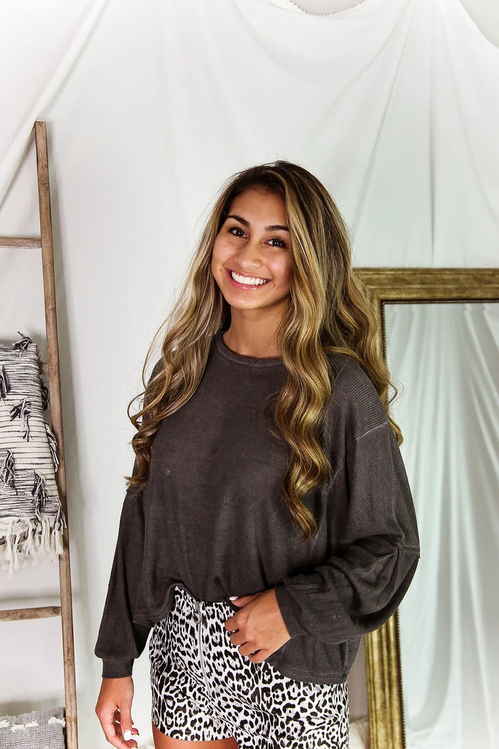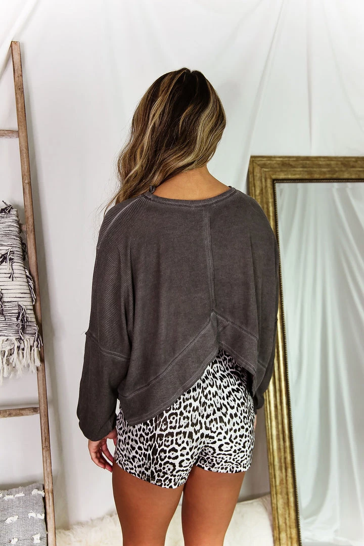 Mustard Seed Charcoal Long Sleeve High Low Waffle Top