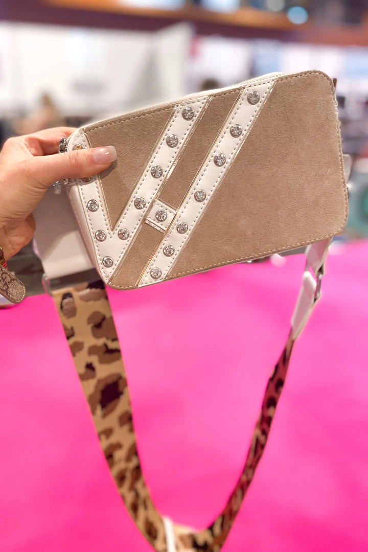 All the glitz and glam in one bag! We love this compact crossbody purse from Vintage Havana featuring suede and rhinestones with two adjustable straps.
