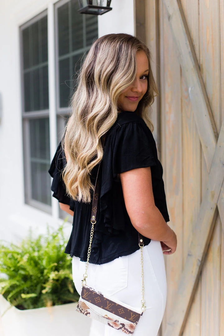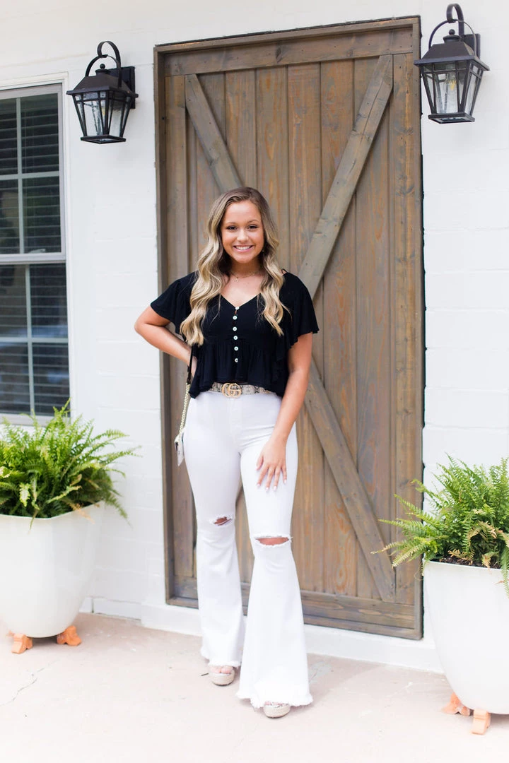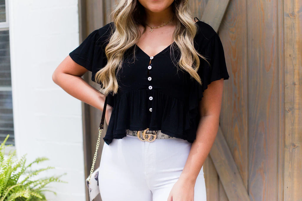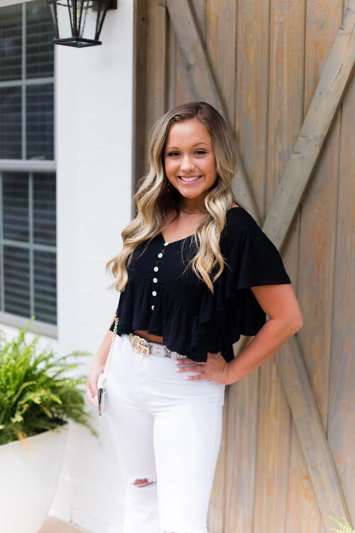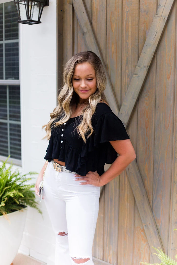 This trendy black blouse features ruffles on the sides and bottom with a distressed hem, buttons in the front and a stylish open back detail with an adjustable strap.