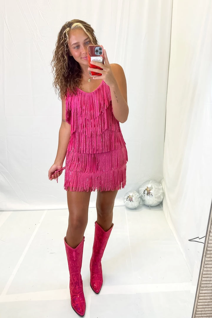 Nylon Apparel Women’s Clothing Hot Pink Metallic Fringe Mini Dress