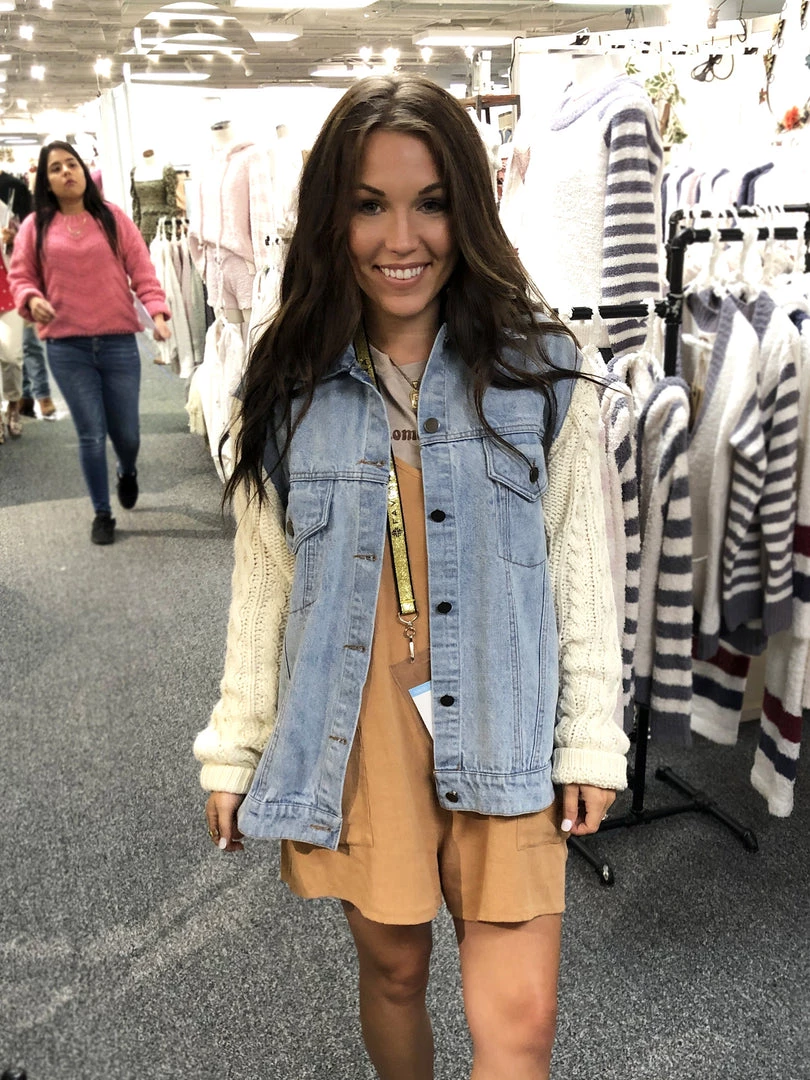The classic light wash denim jacket just got a major upgrade! Featuring an open front bodice with silver buttons and contrasted with soft cream colored cable knit sweater sleeves. Pair this cute jacket with just about anything in your closet!