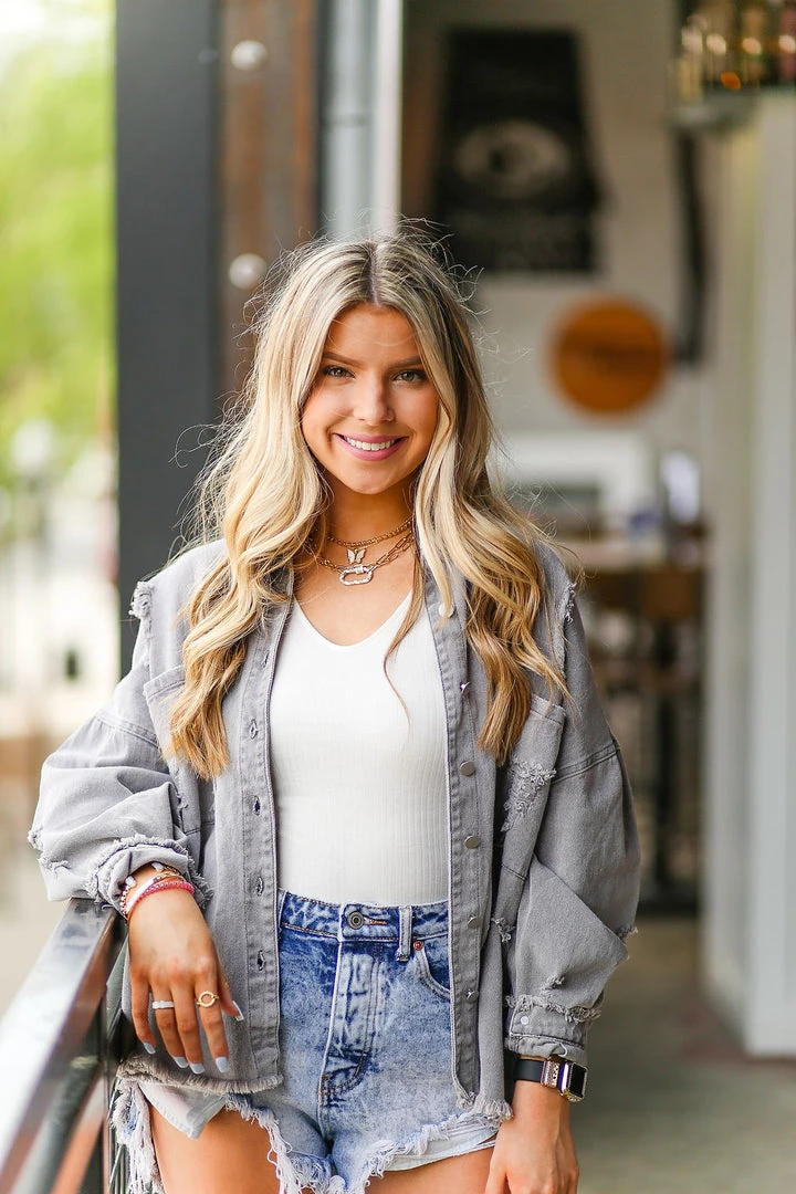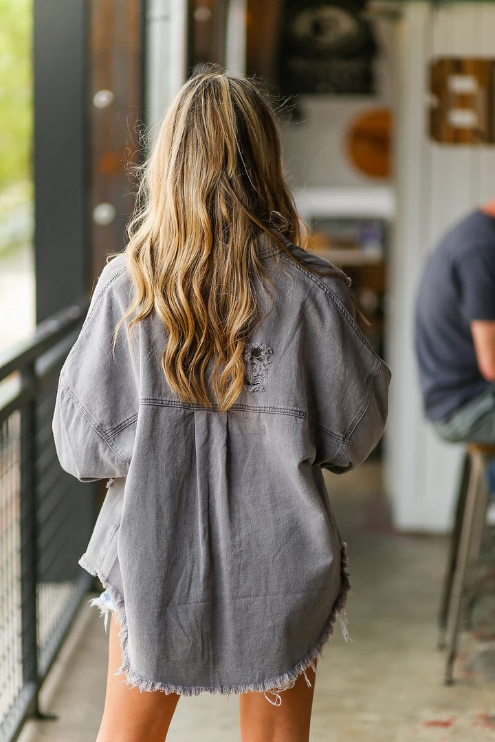 Oversized distressed denim jacket perfect to pair with a cute graphic tee and denim shorts.